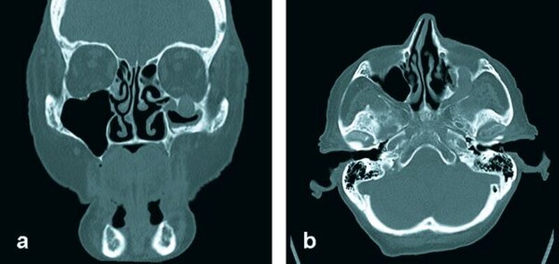 Bei Verdacht auf ein Rezidiv des vordiagnostizierten primitiven neuroektodermalen malignen Tumors wurde zur weiteren Abklärung im Rahmen des Restagings eine Computertomografie des Gesichtsschädels und des Halses veranlasst. Diese ergab einen ausgedehnten Tumor, der sich vom Wangenbereich entlang des Nervus infraorbitalis über die Fissura orbitalis inferior bis zur Schädelbasis wachsend darstellte. Der knöcherne Kanal des Nervus infraorbitalis zeigte sich massiv aufgetrieben (Abbildung 2). Die übrigen, im Rahmen des Stagings veranlassten Untersuchungen (Röntgen-Thorax, Oberbauchsonografie) ergaben keinen Hinweis auf das Vorliegen von Filiae.
