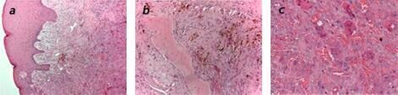 Abschließend erfolgte daher die vollständige Entfernung der Läsion in Kurznarkose. Abbildung 4a zeigt den Aspekt des Resektates und Abbildung 4b den Anschnitt des Präparates. Schon klinisch wird dabei die basale Hartgewebszone erkennbar. Histologisch zeigte sich in der Übersicht (Abbildung 5a) eine an dieser Stelle von regulärem Plattenepithel bedeckte Läsion mit zahlreichen zentralen Riesenzellen in einem gefäßreichen mesenchymalen Stroma. In Abbildung 5b werden die Ossifikation und die deutlichen Hämosiderinablagerungen erkennbar. Die Detailaufnahme (Abbildung 5c) zeigt die Morphologie der Riesenzellen, die von der oberflächlichen Mukosa durch eine Zone fribrösen Bindegewebes getrennt sind. Damit ergab sich abschließend die Diagnose eines peripheren Riesenzellgranuloms (Riesenzell-Epulis).