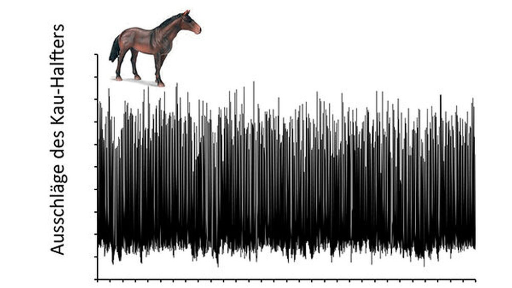 Anders beim Pferd: "Zu unserer Überraschung ergab die Auswertungssoftware, dass das Pferd nicht frisst, sondern sozusagen wiederkaut", erzählt Marie Dittmann, Doktorandin der Universität Zürich und der ETH Zürich. "Obwohl Pferde keine Wiederkäuer sind, zerkleinern sie ihre Nahrung mit ebenso rhythmischen Kauschlägen wie die Kühe beim Wiederkauen."Für Marcus Clauss, Professor an der Klinik für Zoo-, Heim- und Wildtiere der Universität Zürich, ist die Ähnlichkeit im Kaurhythmus von so unterschiedlichen Tiergruppen verständlich: "Pferde haben keine zweite Chance, schwer Verdauliches noch einmal zu zerkleinern. Daher müssen sie gleich beim Fressen sehr gründlich kauen. Das geht offenbar am besten mit rhythmischen und gleichmäßigen Bewegungen."