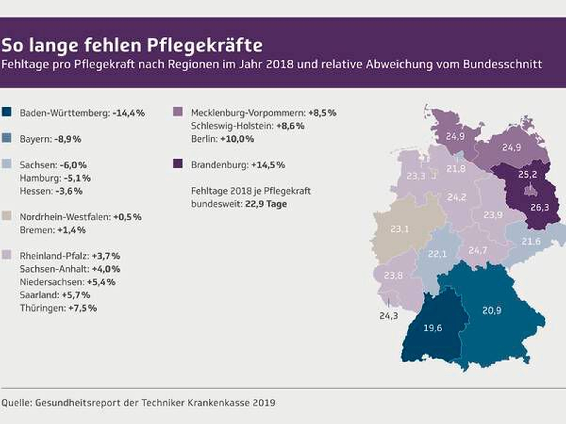 Dem TK-Gesundheitsreport 2019 "Pflegefall Pflegebranche? So geht's Deutschlands Pflegekräften" zufolge fallen Kranken- und Altenpflegekräfte durchschnittlich für rund 23 Tage im Jahr krankheitsbedingt aus. Acht Tage - und über 50 Prozent - mehr als in der Vergleichsgruppe aller Beschäftigten (15 Tage).