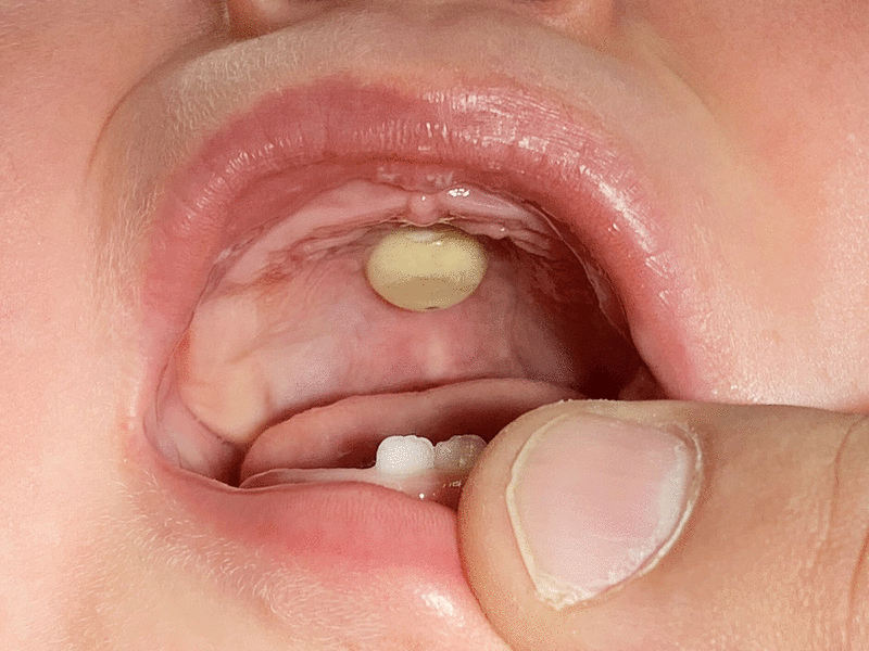 Bei der beschriebenen Lokalisation und dem Erscheinungsbild der Veränderung muss differenzialdiagnostisch insbesondere an eine Fremdkörperinkorporation gedacht werden. Tumoren, Entzündungen oder Eruptionszysten sind im frühen Kindesalter hingegen fast immer im Bereich des Alveolarfortsatzes lokalisiert. Die Aufnahme von Fremdkörpern ist im Kindesalter und bei Erwachsenen mit höhergradiger kognitiver Einschränkung relativ häufig. Komplikationen werden allerdings mit weniger als einem Prozent angegeben [Simo Alari und Gutierrez, 2018]. Das Verschlucken der scharfkantigen Blister-Verpackungen, zum Beispiel von Tabletten, führt hingegen regelmäßig zu schweren Krankheitsbildern mit intestinalen Blutungen und Darmperforationen und kann mitunter fatal sein [Fleres et al., 2018].