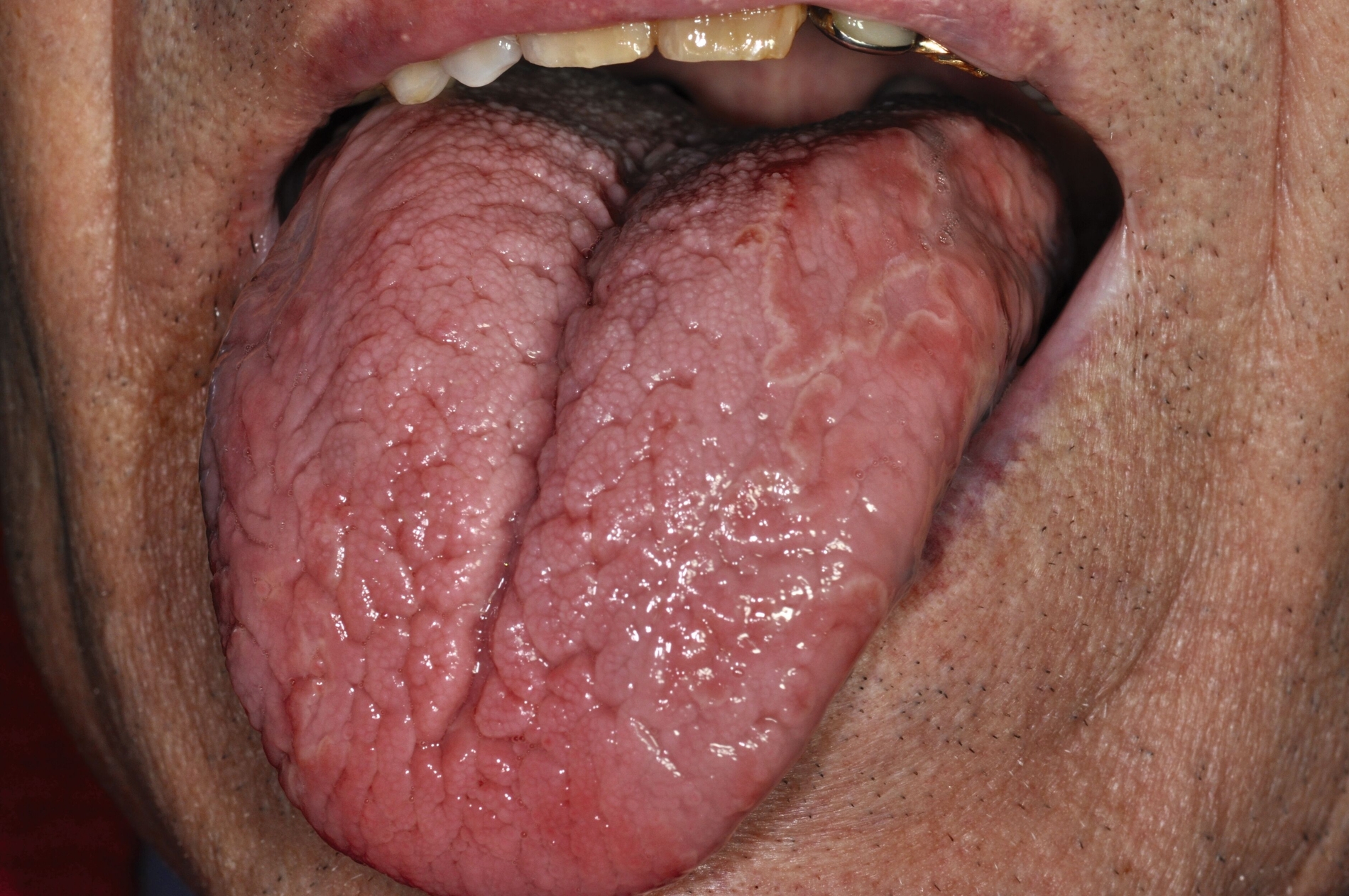 Durch die mechanische Reinigungswirkung des Speichels wird die orale Schleimhaut in gesunden Individuen vor der Kolonisation mit Mikroorganismen geschützt. Fällt diese Reinigungswirkung weg, kann es zu einem Wachstum fakultativ pathogener Keime wie Candida kommen [Turner, 2016]. Die Austrocknung der Zungenoberfläche kann außerdem eine Fissurenbildung bedingen (Abbildung 2). Die in deren Folge verstärkte Retention von Nahrungsresten führt zu einer erhöhten Anfälligkeit gegenüber der Besiedelung mit Pilzen, kann zu Glossodynie oder zum Verlust des Geschmacksempfindens beitragen. Sobald die Mukosa ihre mucinöse Schutzschicht verliert, kann zudem die physiologische Reibung von Zähnen oder prothetischen Restaurationen zu einer Schädigung der Oberfläche führen [Soto et al., 2021; Turner, 2016].