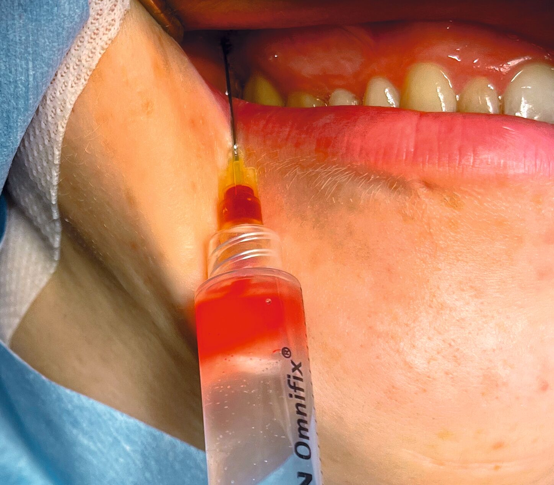 Grundsätzlich wird die Nutzung von Lokalanästhetika in der zahnärztlichen Praxis als sehr sicher erachtet. Jedoch sollten die altersbedingte Veränderung der Metabolisierung, insbesondere eine eingeschränkte Leber- und Nierenfunktion, sowie mit dem Alter häufig einhergehende Allgemeinerkrankungen beachtet werden. Neben den grundsätzlichen Sicherheitskautelen wie einer streng extravasalen Applikation (Abbildung 5), kann eine Reduktion der Dosis des Lokalanästhetikums oder des Vasokonstriktors notwendig werden.