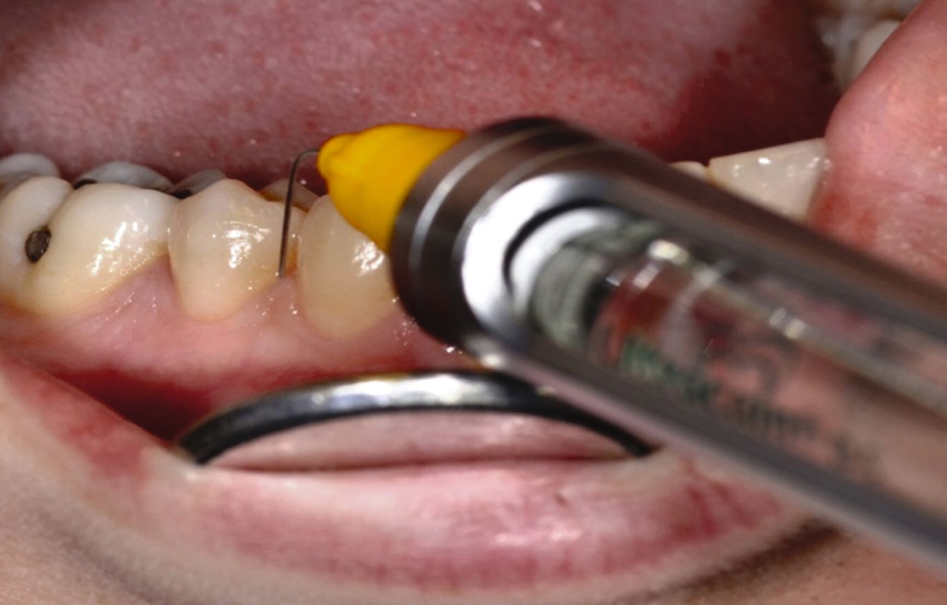 Nach Angaben des Robert Koch-Instituts leiden in Deutschland über 20 Millionen Menschen an arterieller Hypertonie. Patienten mit kardiovaskulären Erkrankungen bilden die größte Risikopopulation in der zahnärztlichen Praxis. Die Komplikationsrate unter zahnärztlicher Lokalanästhesie bei gesunden Patienten liegt bei 3,5 Prozent, bei Vorliegen von kardiovaskulären Erkrankungen steigt das Risiko auf 5,7 Prozent [Daubländer et al., 1997]. Grundsätzlich kann die vermehrte exogene Zufuhr von Vasokonstriktoren zwar zu einer Minderperfusion des Myokards, zu einer Steigerung des Blutdrucks oder zur Dekompensation einer vorbestehenden Herzinsuffizienz führen, dennoch sollte auch bedacht werden, dass bei einer insuffizienten Anästhesie und damit einhergehenden Schmerzen die Menge systemisch freigesetzter Vasokonstriktiva deutlich über dem liegt, was nach der Gabe von Lokalanästhetika zu erwarten ist. Unter der Beachtung absoluter Kontraindikationen empfiehlt sich eine indikationsspezifische Anwendung von Vasokonstriktiva in möglichst geringer Dosierung. Als Technik der Wahl für multimorbide Patienten bietet sich aufgrund der geringen applizierten Menge Lokalanästhetikum die intraligamentäre Anästhesie an (Abbildung 6) [Kämmerer et al., 2018; Nusstein et al., 2004]; hierbei wird selbst unter Zusatz von Adrenalin 1:100.000 kein signifikanter Anstieg der kardiovaskulären Parameter beobachtet [Nusstein et al., 2004].