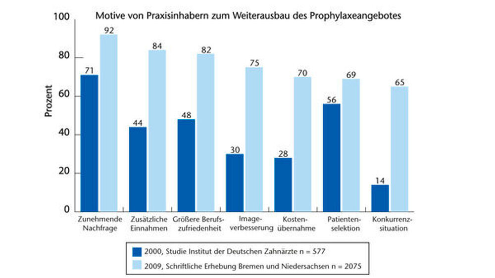 Die Mehrheit der Zahnärzte benennt demnach in beiden Studien die zunehmende Nachfrage der Patienten als wichtigstes Motiv für den weiteren Ausbau der Prophylaxe. Als Vorteile verstärkter Prophylaxemaßnahmen sehen die Zahnärzte demnach einen Imagegewinn für die Praxis, höhere Berufszufriedenheit durch ursachenbezogene Therapie sowie finanzielle Gewinne.