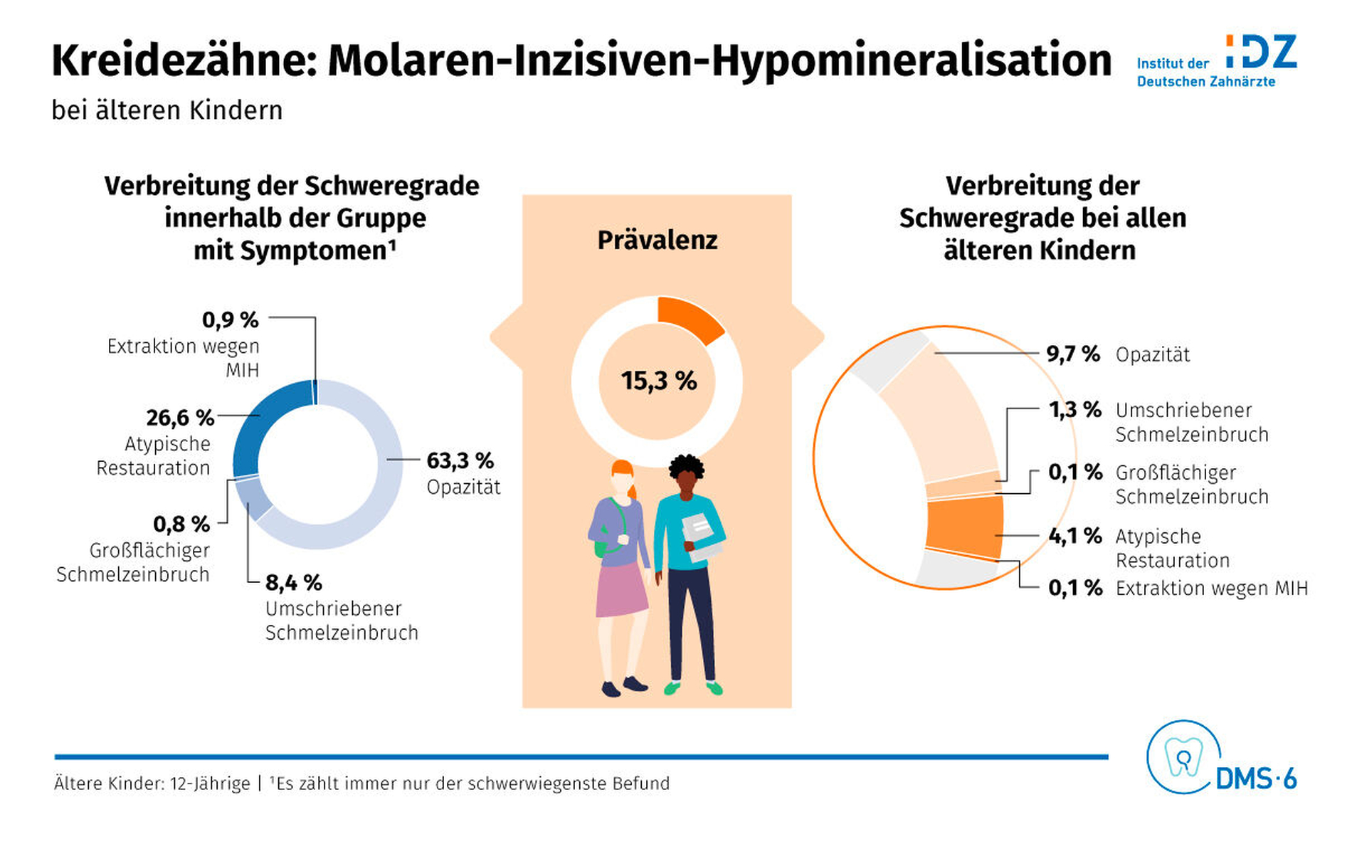 Mehr als jedes siebte Kind im Alter von zwölf Jahren ist laut der DMS • 6 von einer Molaren-Inzisiven-Hypomineralisation (MIH) betroffen (15,3 Prozent), wobei auffällt, dass vermehrt Kinder mit höherem familiären Bildungsstatus erkrankt waren. Milde Formen im Sinne von begrenzten Opazitäten waren am häufigsten (63,3 Prozent), während bei 9,2 Prozent Schmelzeinbrüche vorhanden waren. 26,6 Prozent der Kinder hatten bereits zahnärztliche Restaurationen erhalten. Nur bei 0,9 Prozent wurden bereits MIH-Zähne extrahiert. Durchschnittlich waren bei jedem erkrankten Kind 3,4 Zähne von MIH betroffen.
