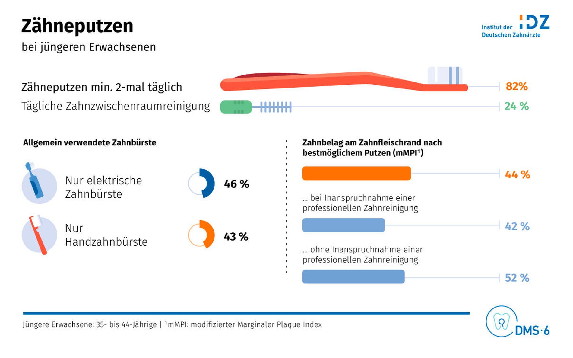 Erstmalig wurde in der DMS • 6 nicht nur das Zahnputzverhalten abgefragt, sondern auch die Zahnputzfertigkeiten auch klinisch mit Hilfe des modifizierten marginalen Plaque-Index (mMPI) untersucht. 84,6 Prozent der älteren Kinder, 82,2 Prozent der jüngeren Erwachsenen und 84,0 Prozent der jüngeren Senioren putzten ihre Zähne zweimal täglich. Knapp 96 Prozent der älteren Kinder und jüngeren Erwachsenen verwendet hierfür fluoridhaltige Zahnpasta. 38,1 Prozent der jüngeren Senioren führten täglich eine Zwischenraumreinigung durch. Nach dem Putzen konnte in allen Gruppen immer noch ein Restzahnbelag von rund 44 bis 52 Prozent festgestellt werden.
