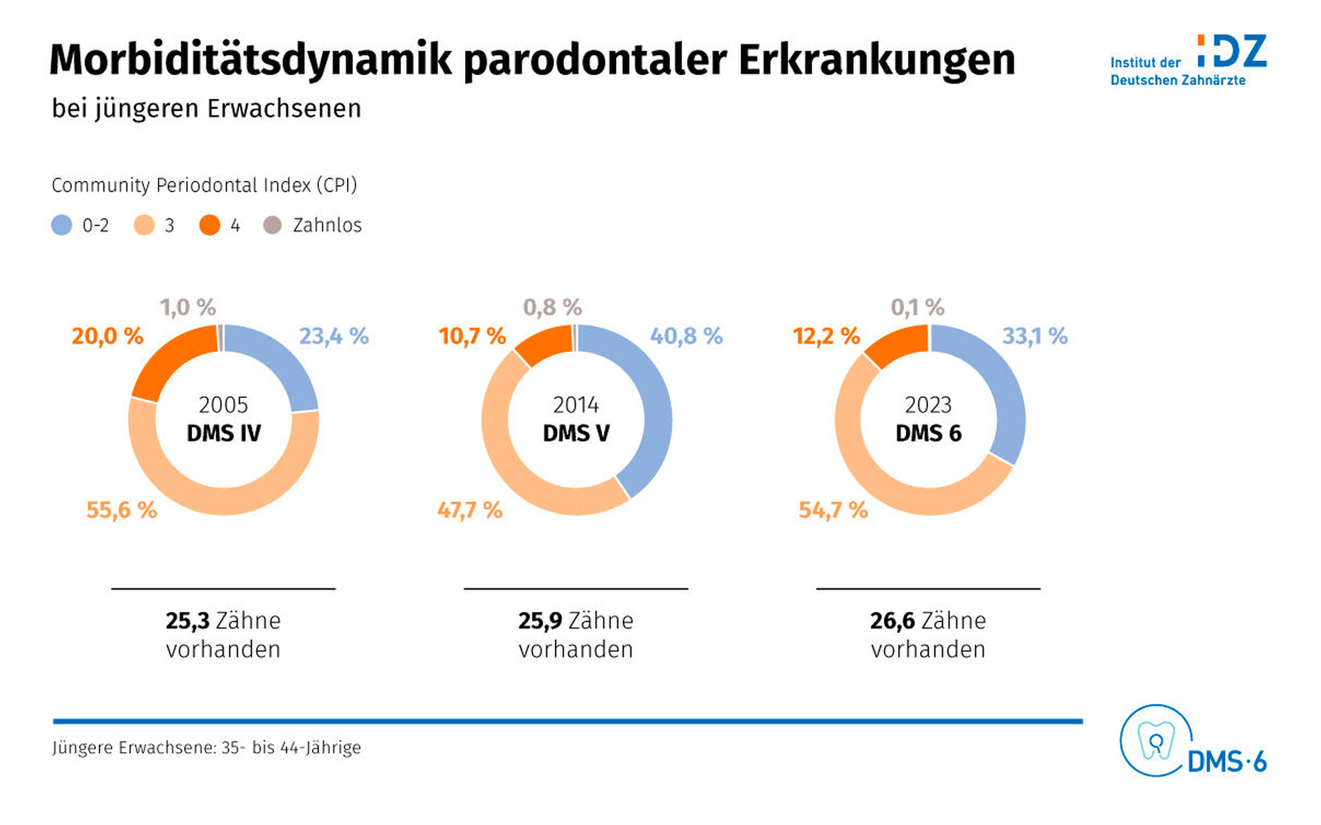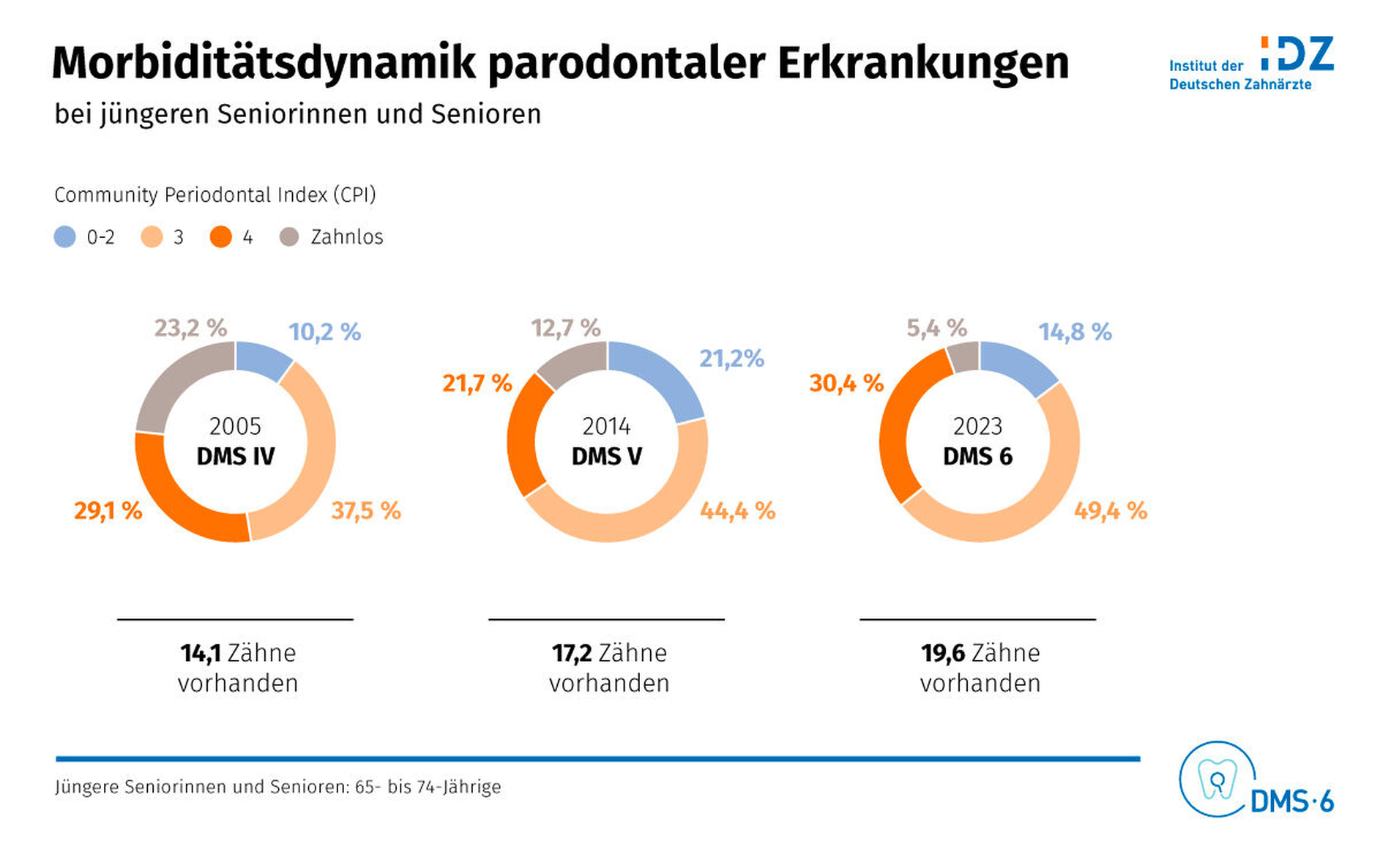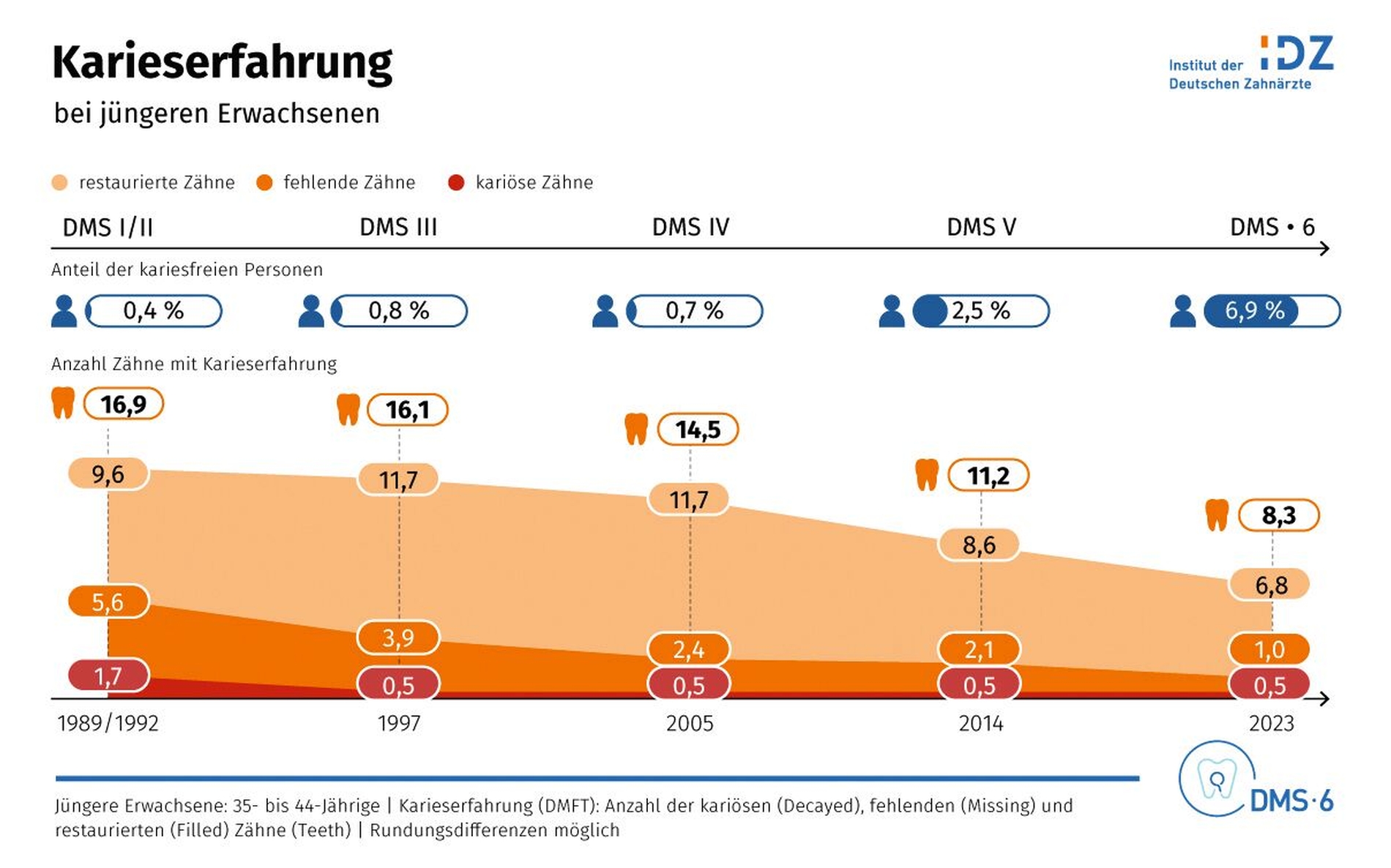 Bei jüngeren Erwachsenen zeigte sich im Vergleich zur DMS V ein deutlicher Rückgang von kariesbedingten Restaurationen: der DMFT (decayed, missing, filled teeth) sank von 11,2 (DMS V) auf 8,3 Zähne. Wurzelkaries konnte bei 13,8 Prozent festgestellt werden, während 6,9 Prozent der jüngeren Erwachsenen eine kariesfreie Dentition hatten. Der DFMT lag bei jüngeren Senioren bei 17,6 Zähnen. Gleichzeitig war der Zahnerhalt höher: Im Vergleich zur DMS 5 fehlten durchschnittlich nur 8,6 anstelle von 11,1 Zähnen.