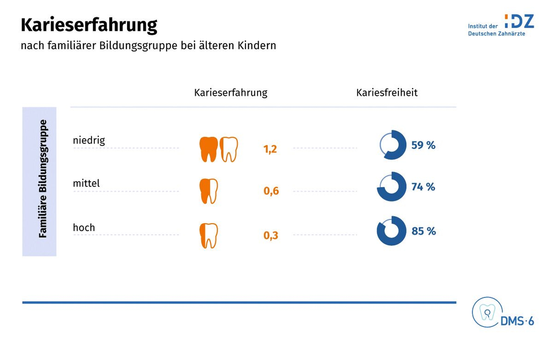 Die Ergebnisse spiegeln einerseits wider, dass sich Präventionsmaßnahmen positiv auf die Mundgesundheit und Karieserfahrung auswirken. Gleichzeitig spitzen sich soziale Ungleichheiten weiter zu, was insbesondere in der Gruppe der Zwölfjährigen deutlich wird: Jugendliche aus Familien mit niedrigerem Bildungsniveau wiesen eine viermal höhere Kariesprävalenz auf als solche aus Familien mit höherem Bildungsstand.
