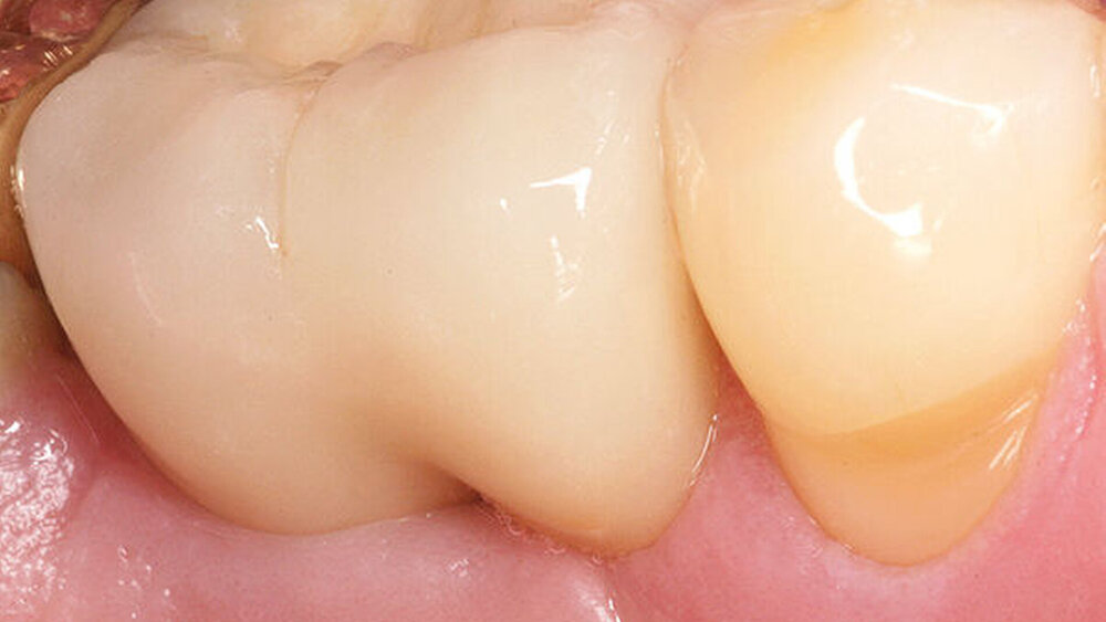 Infektionen der den Zahn umgebenden Gewebe führen infolge einer überschießenden Gewebereaktion zum Knochenabbau und im schlimmsten Fall zum Zahnverlust. Aufgrund der besonderen Situation der Perio-Integration von Implantaten und der ungenügenden Möglichkeiten der Dekontamination bakteriell belasteter Oberflächen ist ein präventiv-konzeptionelles Vorgehen notwendig. Transgingivale, möglichst einteilige Implantate entsprechen der Biologie des natürlichen Zahns eher als zweiteilige Implantate (Abb. 6, 7 und 8). Wir beobachten bei Keramikimplantaten zudem eine bessere Anlagerung der Weichgewebe.