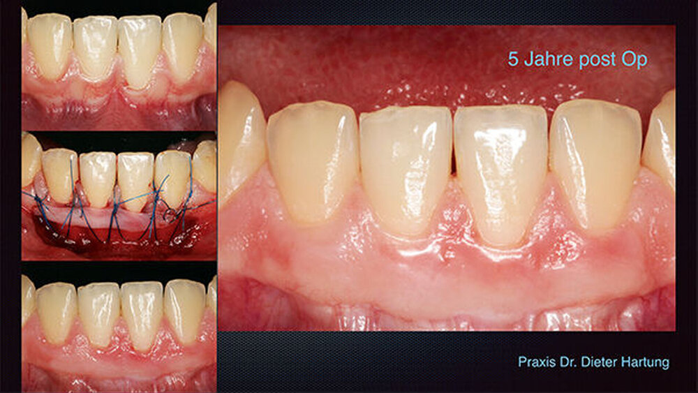 An erster Stelle steht die antiinfektiöse Therapie. Strukturell-funktionelle und/oder ästhetische Gewebedefizite an Zähnen können mit mukogingival-chirurgischen Techniken stabilisiert werden (Abb. 2). Die systematische Dokumentation des Gingivaverlaufs mit einem Scan könnte die Progredienz der Rezessionen, aber auch die Regeneration infolge des Creeping Attachment nach einem chirurgischen Eingriff deutlich machen und die Vorhersagbarkeit verschiedener Methoden gegenüberstellen. Die bildgestützte Darstellung der Situation könnten zur Patienteninformation und in der Folge auch zur Motivation genutzt werden, um eine rechtzeitige Behandlung durchzuführen (Abb. 3, Abb. 4 + 5) .