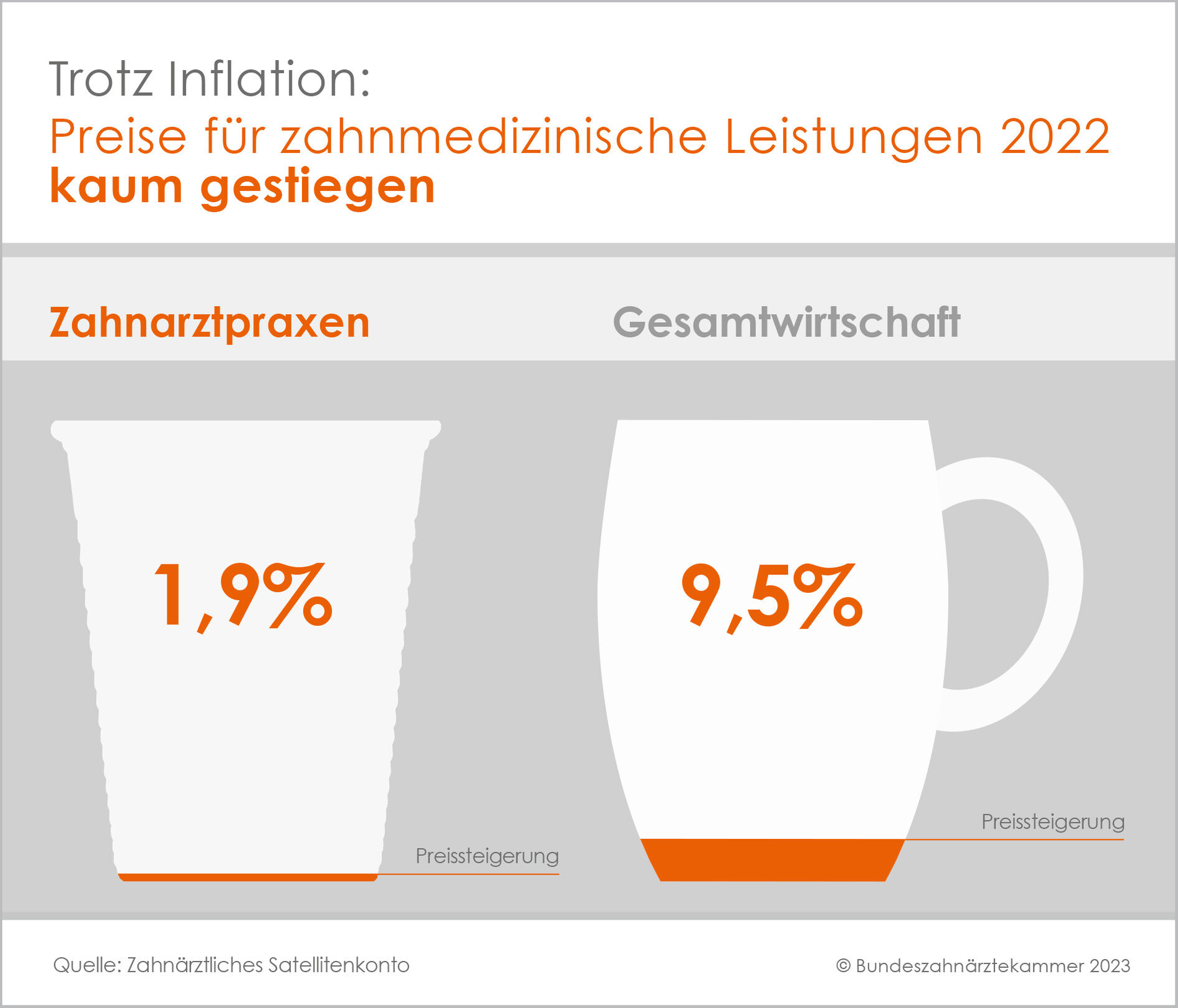 Die hohe Inflation hat die Preise in vielen Bereichen steigen lassen. So wurden in Deutschland produzierte Güter im vergangenen Jahr um etwa 9,5 Prozent teurer. Auch die Praxen spürten die gestiegenen Energie- und Materialkosten, gaben diese aber kaum weiter an die Patienten weiter. Die Kosten für zahnmedizinische Leistungen stiegen im Durchschnitt nur um 1,9 Prozent. Darauf verweist die Bundeszahnärztekammer (BZÄK), die in ihrem aktuellen Statistischen Jahrbuch.