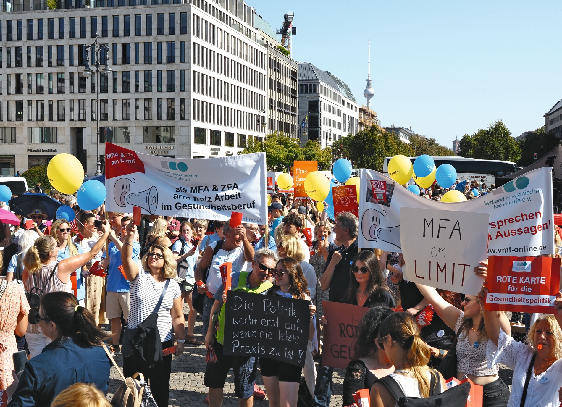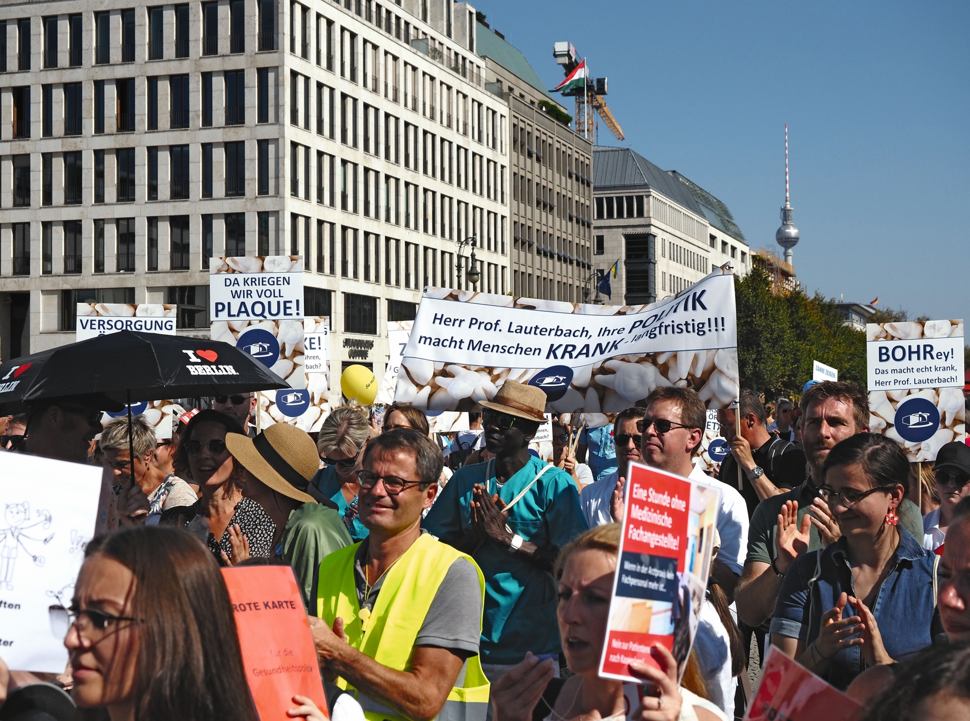 „Versorgung örtlich betäubt!“, „Behandeln statt verwalten“, „Zähne zeigen“ – Auf zahlreichen Plakaten, begleitet vom ohrenbetäubenden Lärm hunderter Trillerpfeifen, machten rund 2.000 Demonstrierende ihrem Frust über die Gesundheitspolitik heute vor dem Brandenburger Tor Luft. Und der Frust war groß.