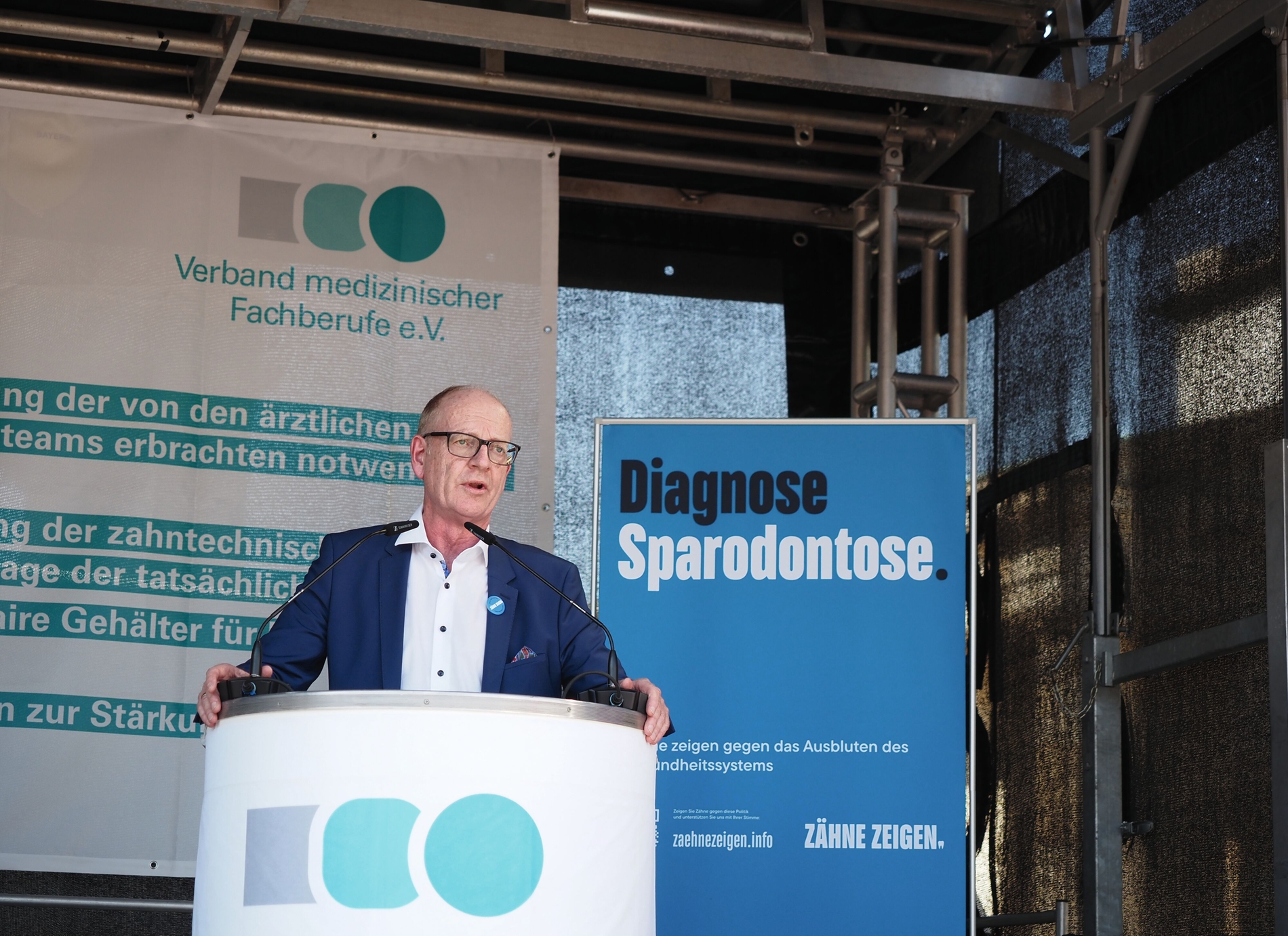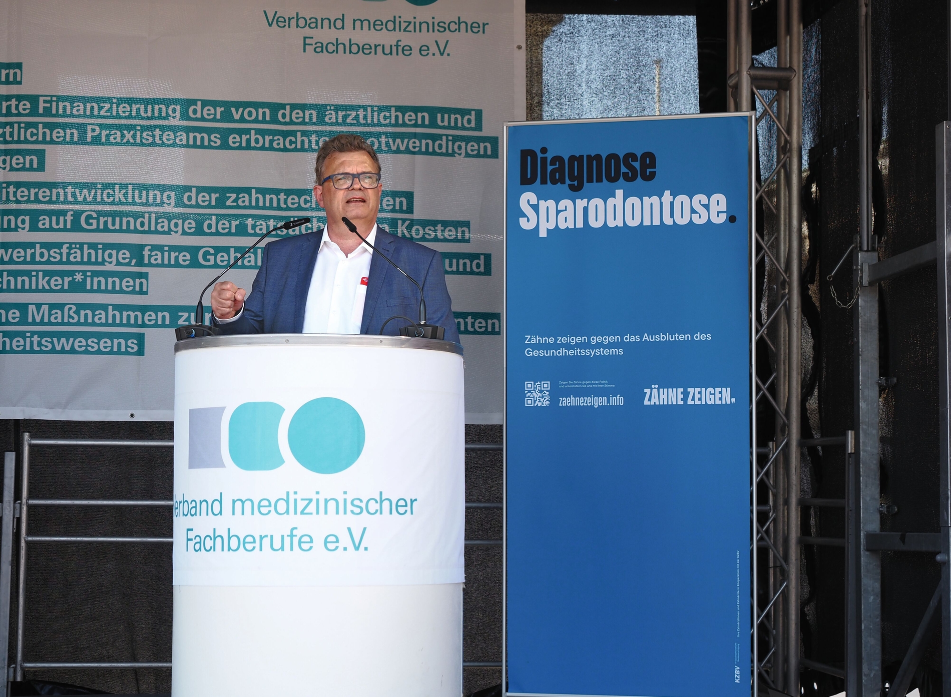 Zu den Rednern auf der Bühne gehörte auch Martin Hendges, Vorsitzender der Kassenzahnärztlichen Bundesvereinigung (KZBV). „Sie sind das Herz unserer Praxen und für eine gute zahnmedizinische Versorgung der Menschen im Land unerlässlich“, sagte Hendges. „Wenn Minister Lauterbach jetzt keine Kursänderung vornimmt, werden die Praxen irreversiblen Schaden nehmen.“ Was es brauche, sei ein schnelles Ende der Budgetierung im zahnmedizinischen Bereich, insbesondere bei der neuen Parodontitis-Behandlung.