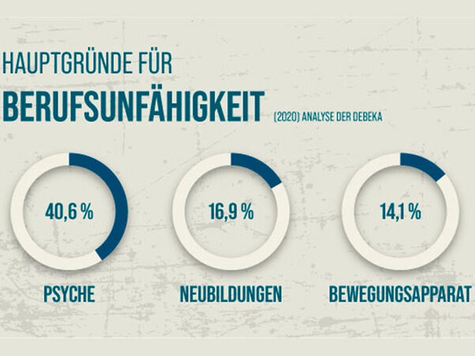 Die viertgrößte Lebensversicherung in Deutschland hat ihren Bestand von rund 481.000 gegen die Berufsunfähigkeit Versicherten für das Jahr 2020 ausgewertet, darunter auch die 950 neu eingetretenen Leistungsfälle in dem Jahr. Der Hauptgrund, den Beruf nicht mehr ausüben zu können, ist demnach mit 40,6 Prozent eine psychische Störung. 2019 betrug dieser Anteil noch 44,1 Prozent. Darauf folgen mit 16,9 Prozent Geschwülste wie zum Beispiel Krebserkrankungen und mit 14,1 Prozent auf Platz drei Störungen des Bewegungsapparats wie den Rücken oder Gelenke betreffend.