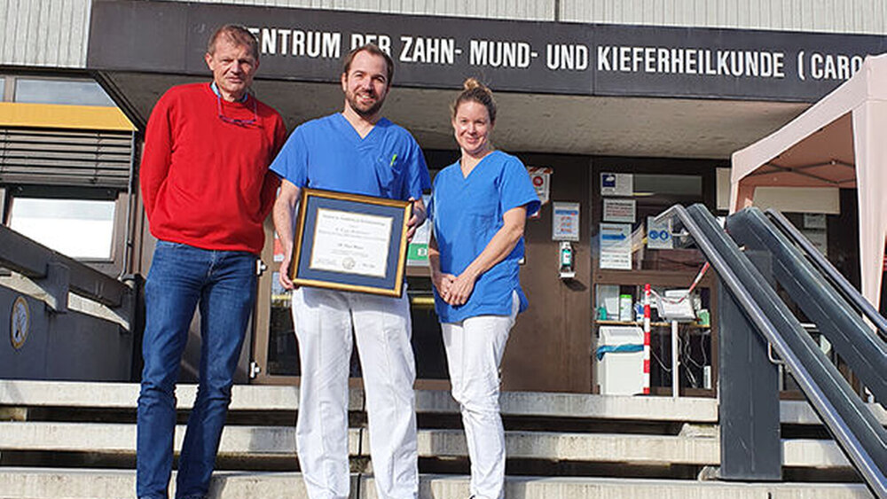 Dieses Jahr ging dieser Preis erstmalig seit Bestehen an eine deutsche Autorengruppe, angeführt von Dr. Hari Petsos, nach Frankfurt am Main. Ausgezeichnet wurden Petsos und seine Koautoren, Prof. P. Ratka-Krüger (Freiburg), PD Dr. K. Nickles, Dr. E. Neukranz, Prof. P. Raetzke sowie Prof. P. Eickholz (alle Frankfurt/Main), für ihren Beitrag „Infrabony defects 20 years after open flap debridement and guided tissue regeneration“ im Journal of Clinical Periodontology [Petsos et al., 2019].