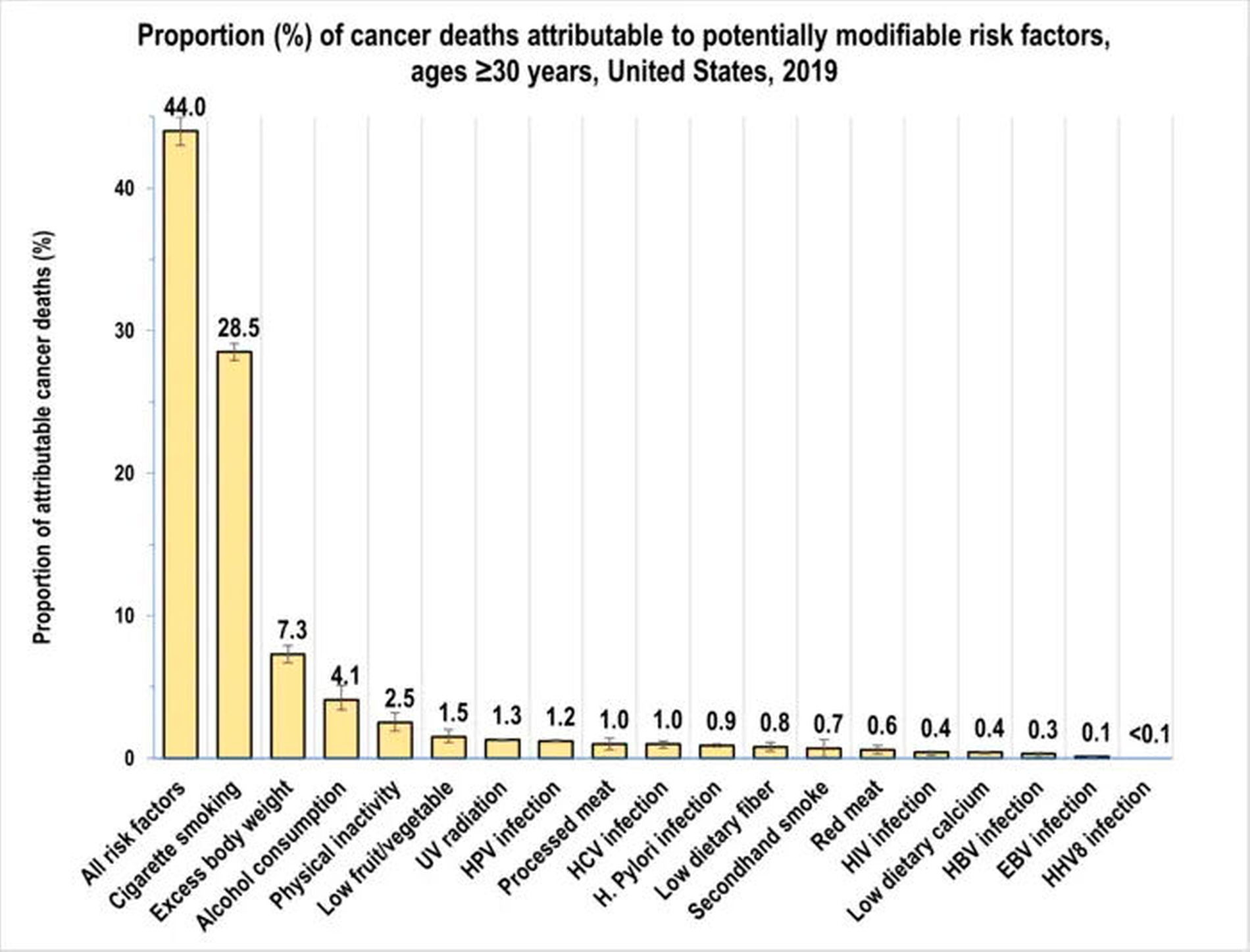 Islami F, Goding Sauer A, Miller KD, et al. Proportion and number of cancer cases and deaths attributable to potentially modifiable risk factors in the United States. CA Cancer J Clin. 2018 Jan;68(1):31-54. doi: 10.3322/caac.21440. Epub 2017 Nov 21. PMID: 29160902.