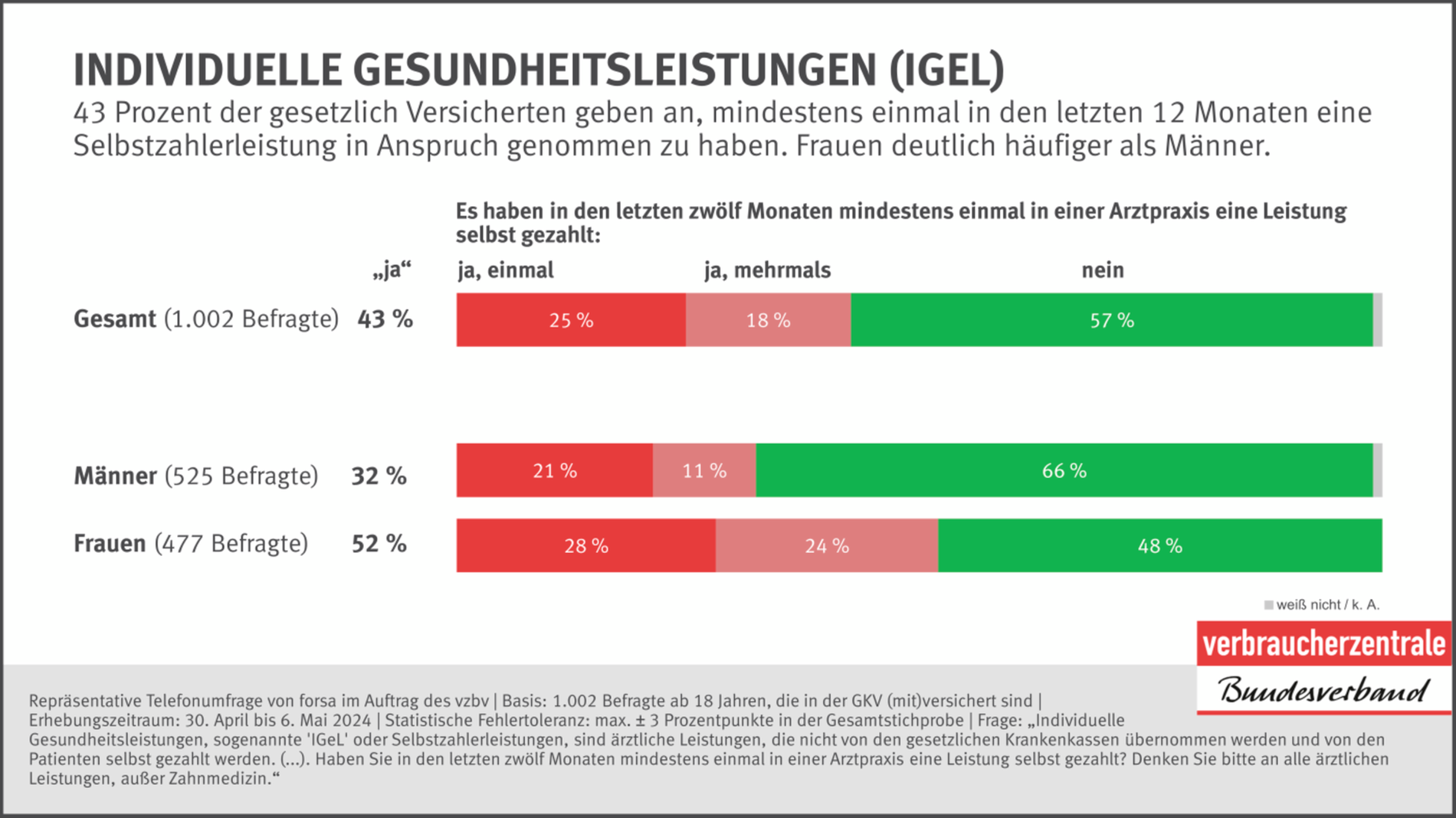 Die repräsentative Telefonbefragung wurde vom 30. April bis 6. Mai 2024 von forsa im Auftrag des vzbv durchgeführt. Bfragt wurden 1.002 Erwachsene, die in der gesetzlichen Krankenkasse (mit-)versichert sind.