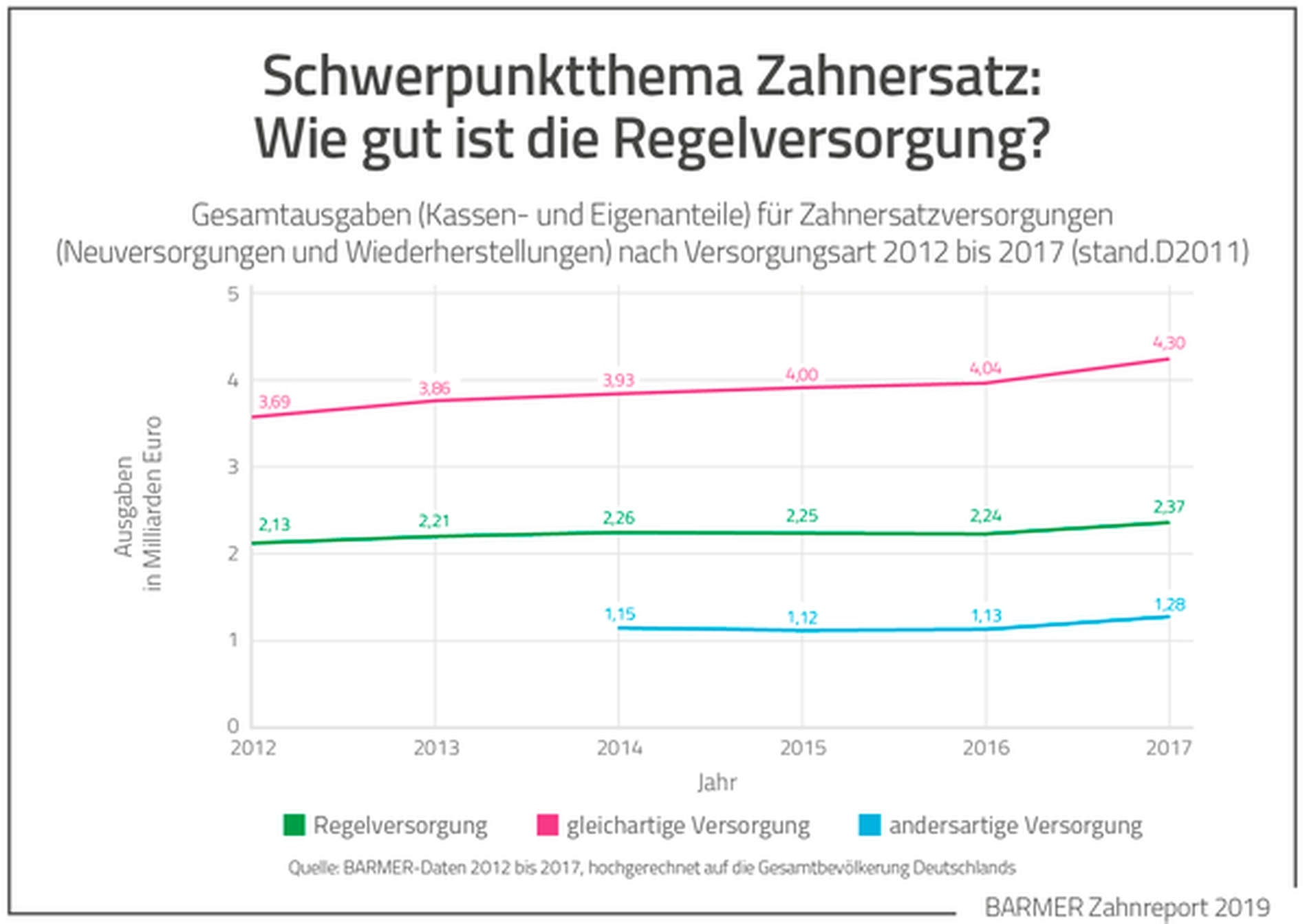 Die Autoren des Reports hatten untersucht, wie gut die Regelversorgung gegenüber anderen Versorgungsarten abschneidet. Für ein differenziertes Bild der Inanspruchnahme, Ausgaben und Nutzungsdauer von Zahnersatz wurden Daten der vertragszahnärztlichen Versorgung von 7,25 Millionen Barmer-Versicherten analysiert und auf die Gesamtbevölkerung der Bundesrepublik Deutschland hochgerechnet.