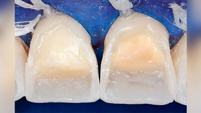 Das Komposit wurde dazu in einer der fehlenden Zahnsubstanz entsprechenden Menge in die Übertragungsschiene (Abb. 6) eingebracht und unter einem selbsthergestellten Lichtschutz aus Teflon für etwa 5 Minuten auf einer Wärmeplatte (Calset; AdDent, Danbury, USA) erwärmt. Durch das Erwärmen wird die Fließeigenschaft des Komposits verbessert, wodurch die Positionierung der Schiene erleichtert wird, ohne die Materialeigenschaften des Komposits zu beeinträchtigen (Tauböck et al. 2015).