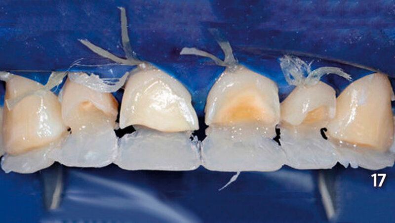 Nach Kofferdamapplikation und Vorbehandlung mit Adhäsiv konnte nun mithilfe des Silikonschlüssels der inzisal-palatinale Anteil der Zähne mit Komposit-Schmelzmasse (Farbe A2E) aufgebaut werden (Abb. 17). Schließlich wurden mithilfe von Transparentmatrizen die approximalen Randleisten ebenfalls mit Schmelzmasse modelliert (Abb. 18). In die so gestaltete Umrissform der Zähne wurden nach Entfernung der Matrizen Kompositdentinmassen (Farbe A4D) appliziert und mit Effektfarbe (Farbe Y) sowie weißer Malfarbe (IPS Empress Direct Color, IvoclarVivadent, Schaan, Liechtenstein) charakterisiert (Abb. 19).