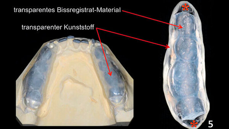 Bei der Anfertigung der Wax-up-Modelle wurden jeweils die Eckzähne und Bereiche der endständigen Molaren nicht mit Wachs aufgebaut (Abb. 4). Auf den Modellen wurden dann für den Unterkiefer je zwei stabile, lichtdurchlässige Übertragungsschienen hergestellt, die später im Mund eine ausreichende Abstützung an den nicht aufgewachsten Eckzähnen und den distalen Bereichen der endständigen Molaren gewährleisteten (Abb. 5).