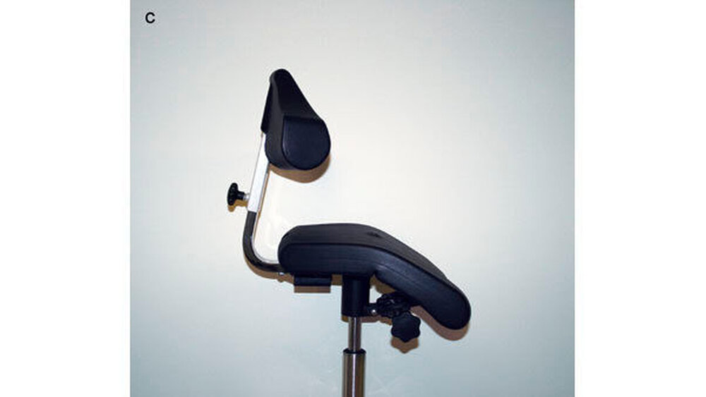 Eine Rückenlehne in statischem Sinne ist nicht erforderlich. Sie ist eher eine „Gedankenstütze“ für unsere Wirbelsäule, um sich stets der natürlichen Lordosehaltung für eine symmetrische und stabile Arbeitshaltung zu erinnern und sich während der Behandlung nicht in einer gesundheitsschädigenden C-Haltung mit abgesenkten Schultern zu krümmen. Die Lehne ist deshalb frei beweglich rotierend um eine horizontale Achse (25º auf- und abwärts) und – bei einer Höhe von 10 bis 12 cm und einer Breite von maximal 30 cm – am oberen Rand (1 bis 2 cm) elastisch, ansonsten weich gepolstert. Das Polster kann leicht eingedrückt werden, um sich der Wirbelsäulenkurvatur horizontal und vertikal geschmeidig anzupassen – auch um dem Oberkörper mehr Bewegungsfreiheit zu gönnen. Sie ist vertikal einstellbar von 17 bis 22, bei großen Zahnärzten bis 24 cm, so dass sie das Becken gerade am oberen hinteren Rand quasi touchiert.