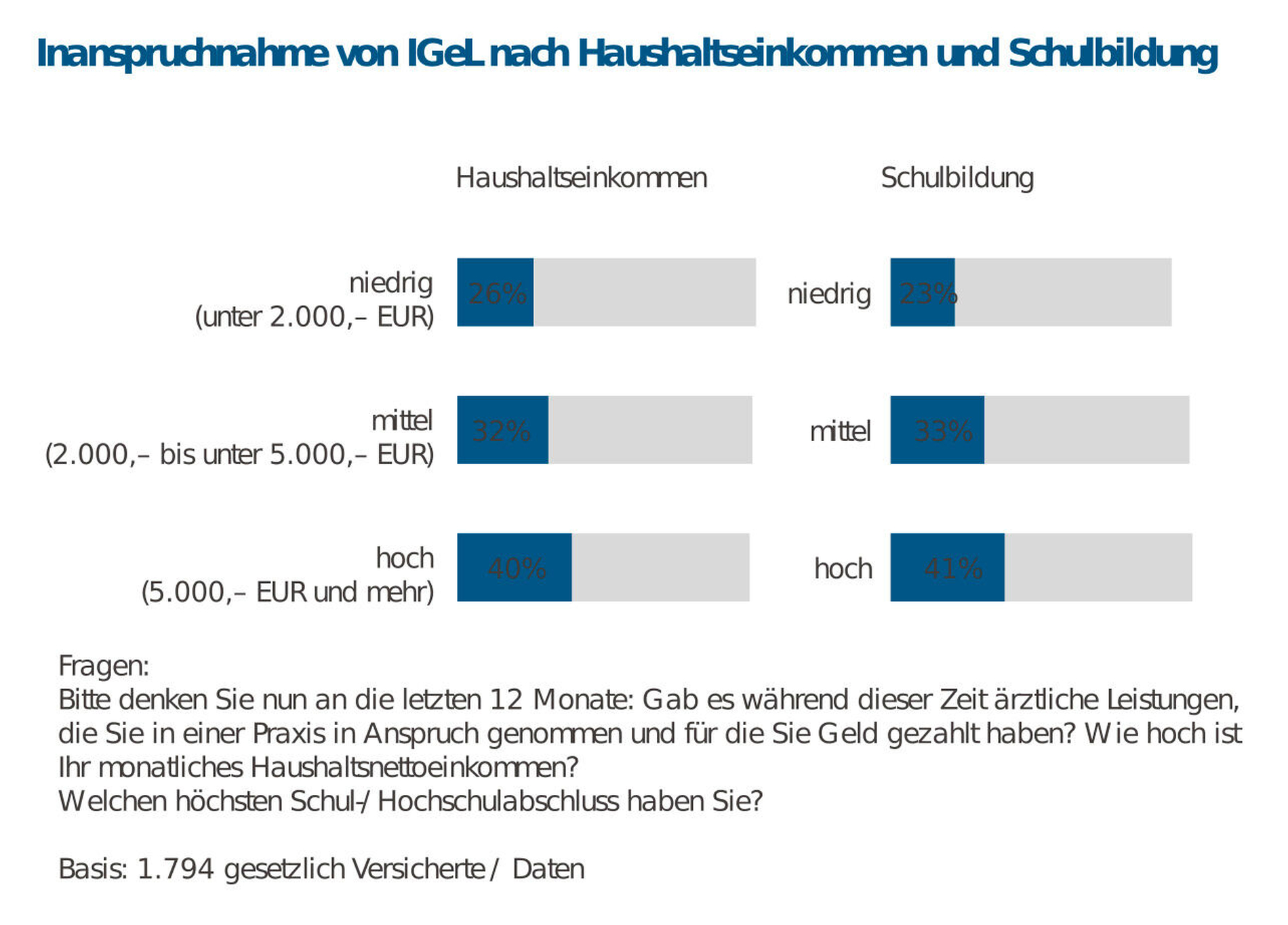 Regionen: In den südlichen Bundesländern werden IGeL mit 37 Prozent häufiger in Anspruch genommen als in den westlichen (33 Prozent), den nördlichen (31 Prozent) oder den östlichen (26 Prozent). Ein Stadt-Land-Gefälle war nicht feststellbar.