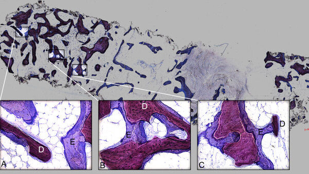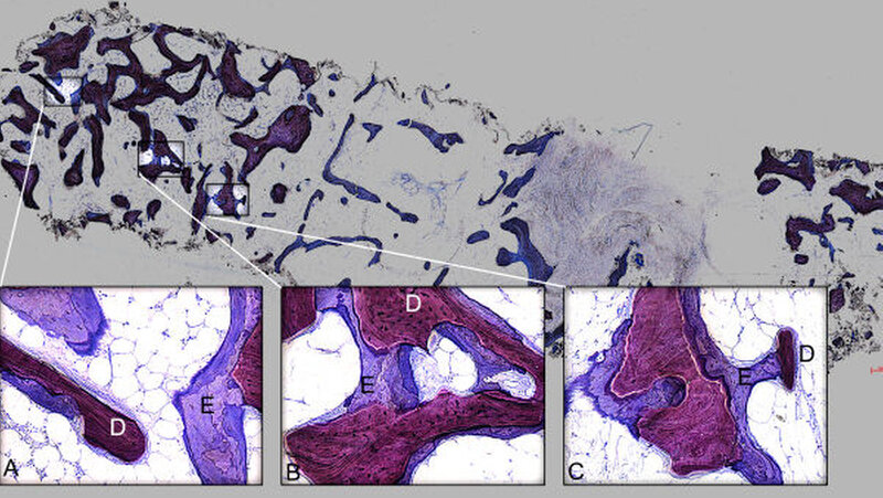 Ergebnis: Das Material wurde auch nach diesem langen Zeitraum nicht vom Körper aufgelöst. Vielmehr kam es zu einer erfolgreichen Knochenneubildung. Aynas Untersuchung weist in dem aufgebauten Knochenbereich einen Eigenknochenanteil von mindestens 14 Prozent nach. Die histologischen Untersuchungen lassen darauf schließen, dass der Sinuslift in den zentralen Bereichen aus vitalem Knochen besteht.