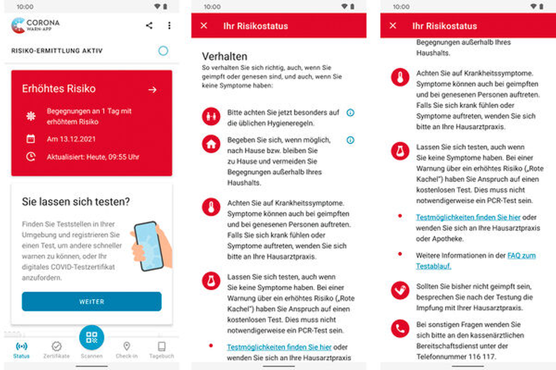 Wer die Statusanzeige „Erhöhtes Risiko” auf sein Smartphone bekommt, hatte in den vergangenen 14 Tagen mindestens eine Begegnung mit einer später positiv getesteten Person, teilt das Robert Koch-Institut (RKI) mit. Deswegen gibt es nun die Empfehlung – unabhängig davon, ob der Nutzer ungeimpft, geimpft oder genesen ist, sich im Falle dieser Warnung folgendermaßen zu verhalten: