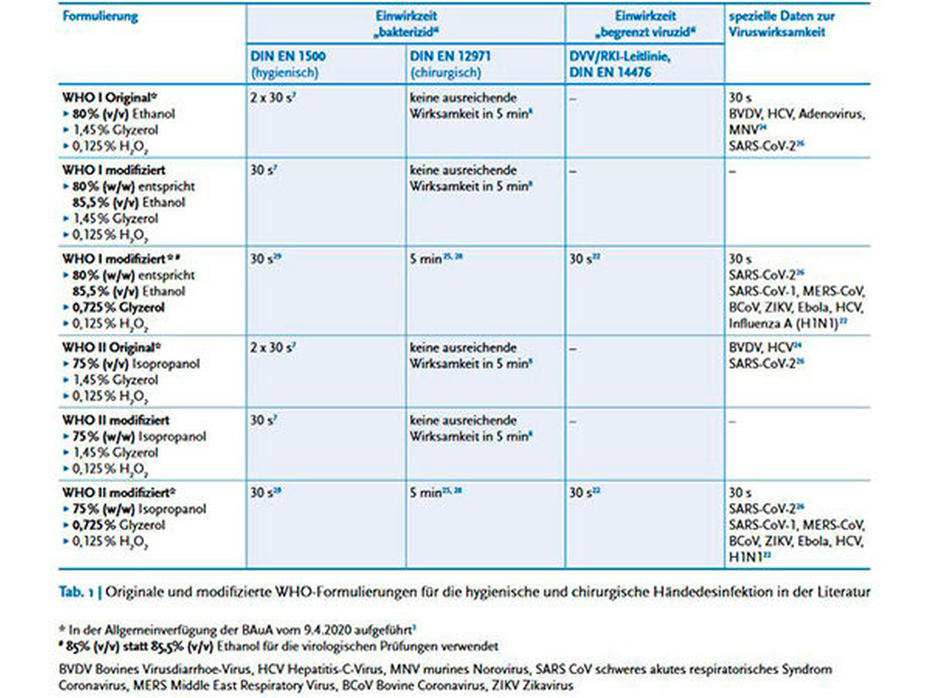 Zudem listet der RKI-Bericht die Alternativen und Modifikationen der WHO-Formulierungen auf. Bei der Eigenherstellung muss darauf geachtet werden, dass die Hersteller der Rohstoffe Analyse-Zertifikate dem Anwender vorlegen, um die Qualität und Unbedenklichkeit für die Anwendung zu gewährleisten.