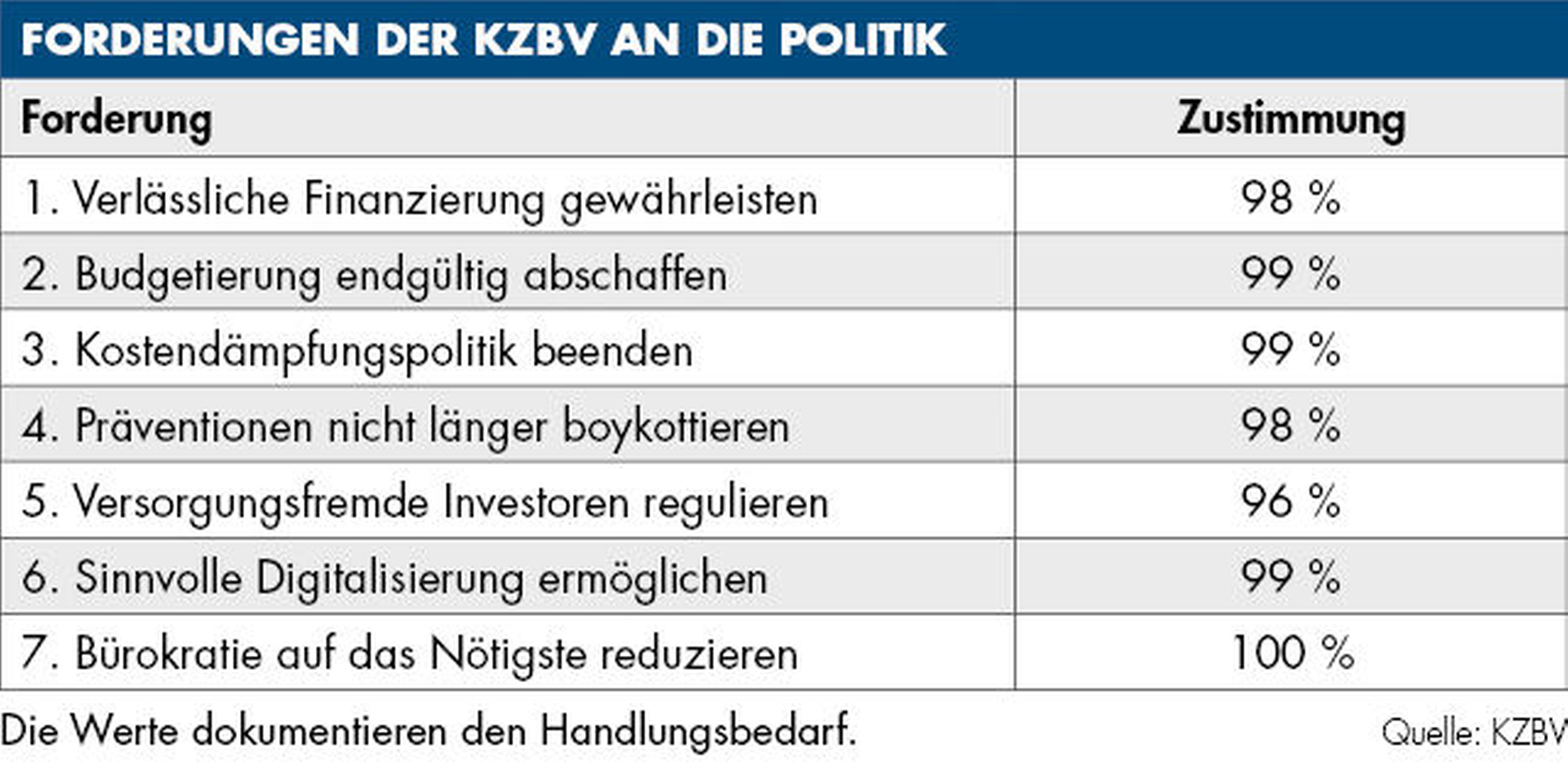 Die Zahnarztpraxen an der Basis und auch die KZBV prangern diese Missstände schon seit Jahren an. Um über die Folgen zu informieren, hat die KZBV im vergangenen Jahr die Kampagne „Zähne zeigen“ gestartet. Sie wird – erweitert und modifiziert – auch in diesem Jahr weitergeführt, um verstärkt die breite Öffentlichkeit anzusprechen. Wie die Befragung zeigt, stehen die Zahnärztinnen und Zahnärzte geschlossen hinter den gesundheitspolitischen Forderungen der KZBV, insbesondere verlangen sie weniger Bürokratie, eine tragfähige Finanzierung, eine praxistaugliche Digitalisierung und die Abschaffung der Mittelbegrenzung.