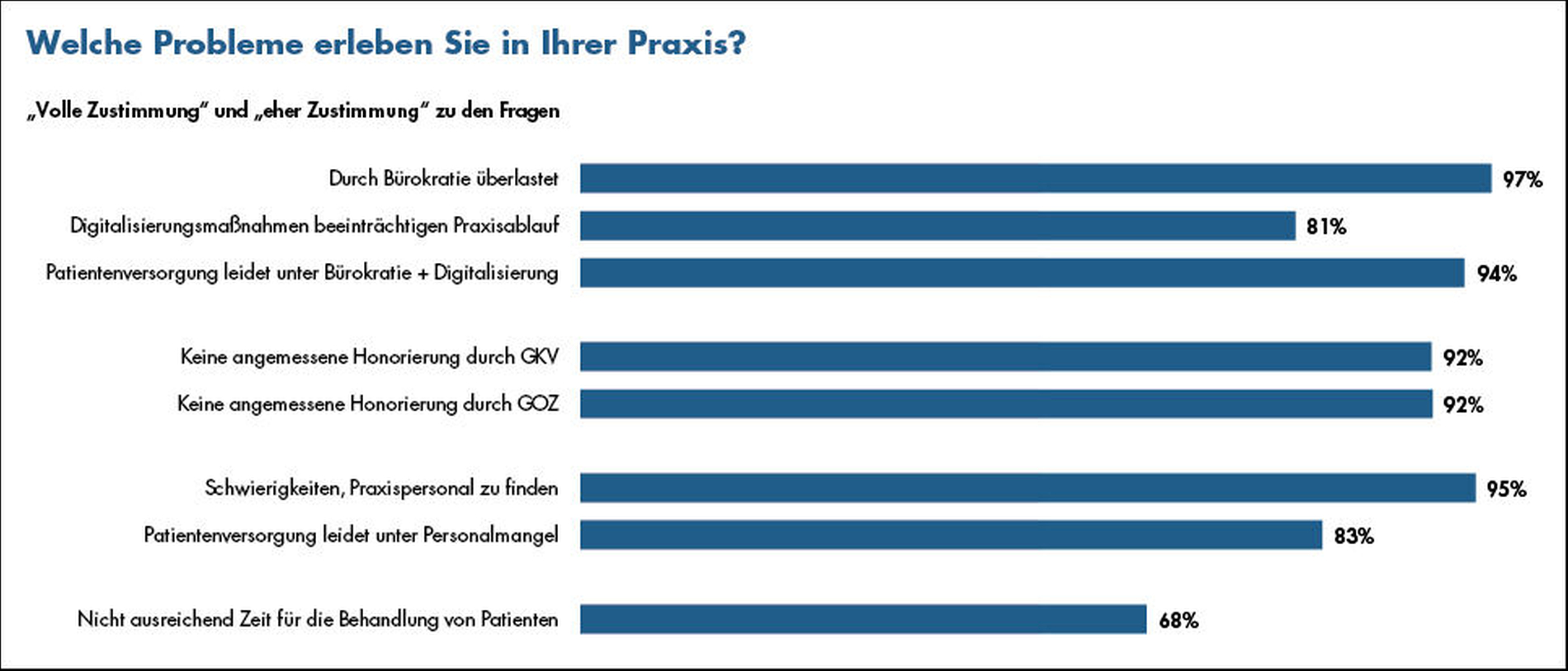 Vor allem die überbordende Bürokratie sorgt im Praxisalltag für Ärger: Ganze 97 Prozent der Befragten fühlen sich dadurch überlastet, bei 94 Prozent leidet sogar mittlerweile die Patientenversorgung unter dem Zeitmangel durch unsinnige Vorschriften und praxisuntaugliche Digitalisierung. Ein weiteres Sorgenthema: der Fachkräftemangel. Insgesamt 95 Prozent der Zahnärztinnen und Zahnärzte haben Probleme, geeignetes Personal zu finden, bei 83 Prozent hat die Personalnot bereits Auswirkungen auf die Patientenversorgung.