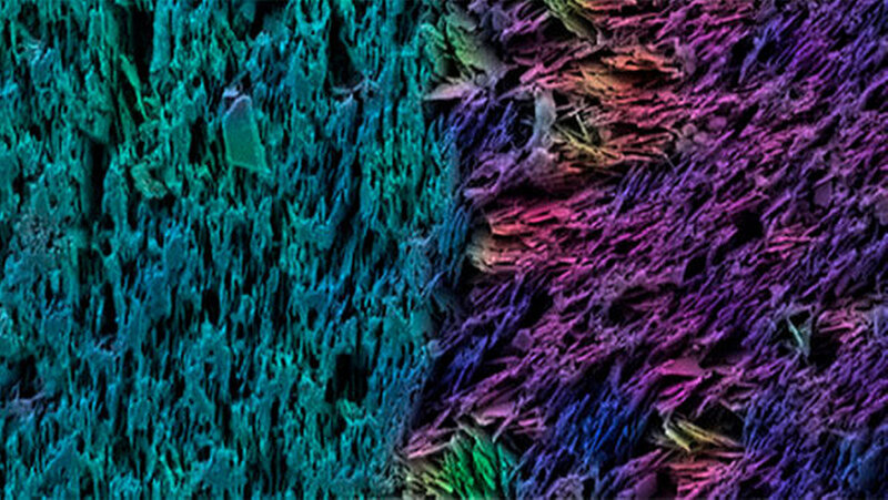 Erst stellten die Erstautorin der Studie, die Doktorandin Hortense Le Ferrand, und ihre Kollegen einen Gipsabdruck eines menschlichen Weisheitszahnes her. Diese Gussform befüllten sie mit einer Suspension, die neben Aluminiumoxid-Plättchen auch Glas-Nanopartikel als Mörtel enthielt. Mit einem Magneten richteten sie die Plättchen senkrecht zur Oberfläche ihres Objektes aus. Nachdem die erste Lage trocken war, gossen die Wissenschaftler eine zweite Suspension in dieselbe Gussform. Diese Suspension enthielt jedoch keine Glaspartikel. Die Aluminiumoxid-Plättchen in der zweiten Schicht wurden mithilfe des Magneten waagrecht zur Zahnoberfläche ausgerichtet.