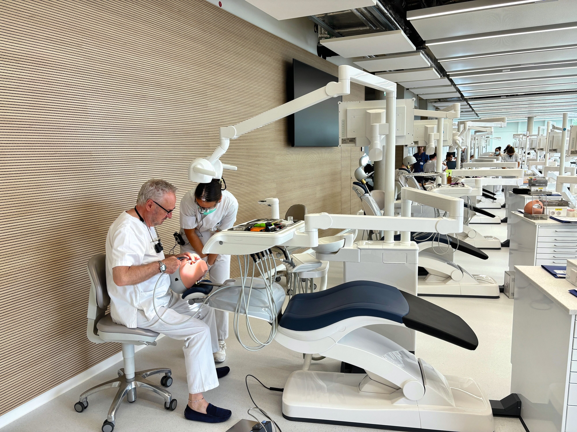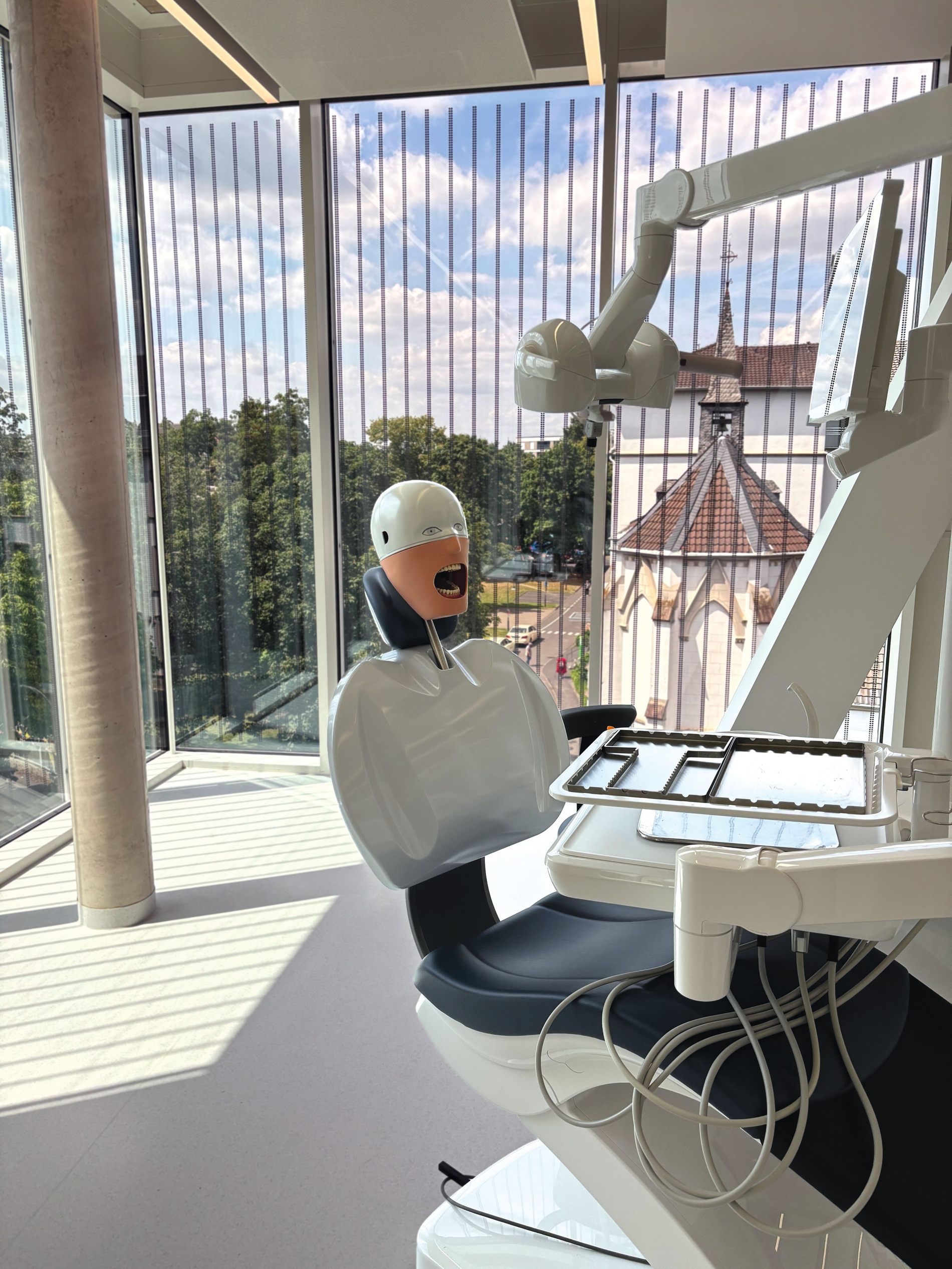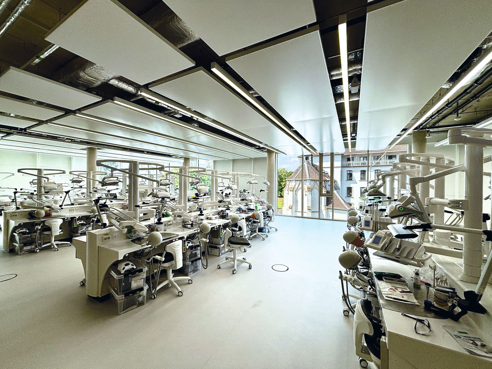 Besonders hervorheben möchte ich die Forum-Anordnungen der Behandlungseinheiten für Demonstrationen als sichtbare Antwort auf veränderte Curricula. Auch die Medientechnik ist auf höchstem Niveau: Live-Demonstrationen können in alle Praktikums- und Seminarräume sowie per Webstream übertragen werden. 83-Zoll-Bildschirme pro Raum sorgen für optimale Sicht, egal ob es um Patienten-, Phantom- oder Technikdemonstrationen geht.