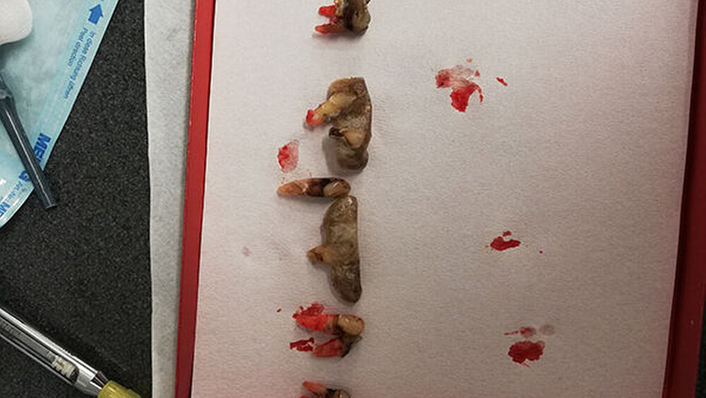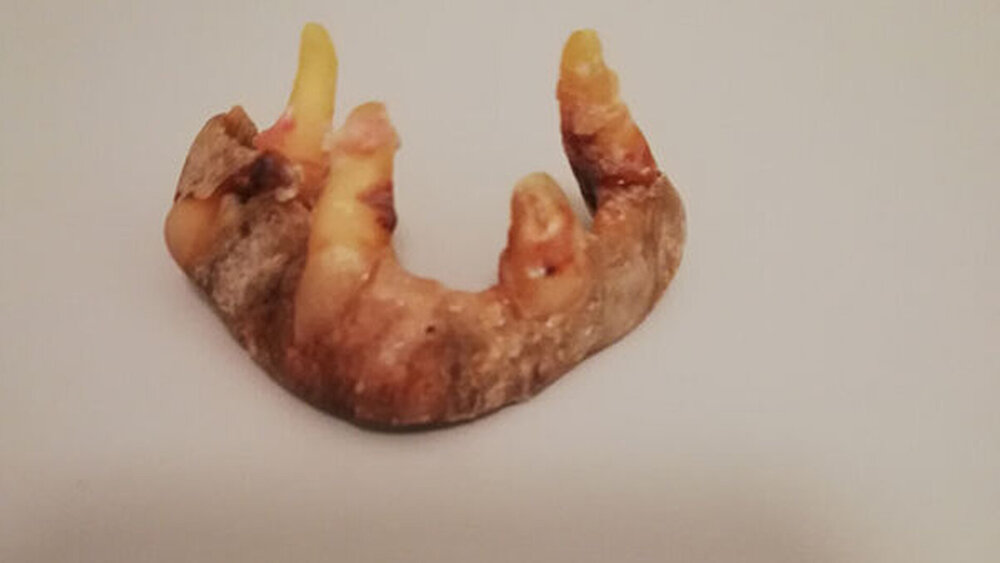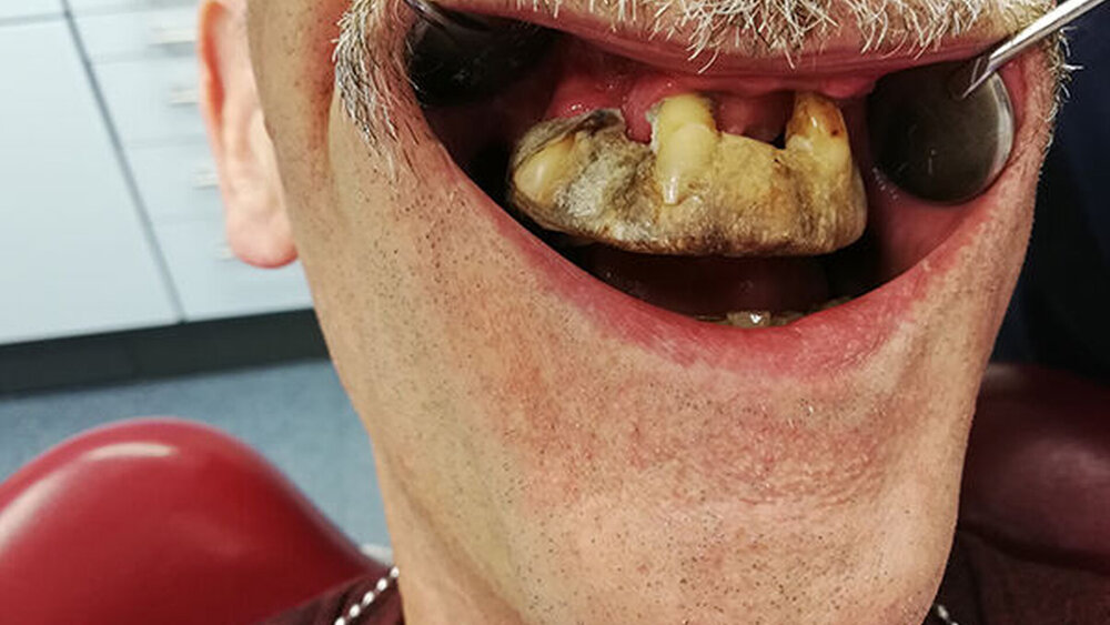 Kassel: Der 63-jährige Patient, pensionierter Beamter, hatte über Jahre die parodontal geschädigten Zähne selbst extrahiert und sich mithilfe von Sekundenkleber eine kleine Prothese beziehungsweise Brücke gebaut.