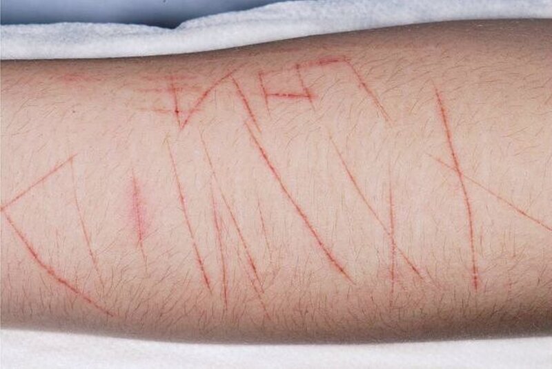 Neben den klassischen „direkten“ Selbstverletzungen (Abbildung 3) – typischerweise durch Kratzen, Ritzen, Schneiden oder Verbrennungen – haben in der medizinischen und zahnmedizinischen Betreuung auch „indirekte“ Selbstverletzungen Bedeutung. Hierbei handelt es sich um die Herbeiführung invasiver ärztlicher beziehungsweise zahnärztlicher Maßnahmen durch die Vortäuschung von Symptomen. Dieses „sich selbst krank machen“ kann sich sowohl auf die eigene Person als auch auf andere beziehen, betroffen sind hier vor allem Kinder, durch deren Verletzung medizinische Betreuung (Zuwendung) induziert wird.