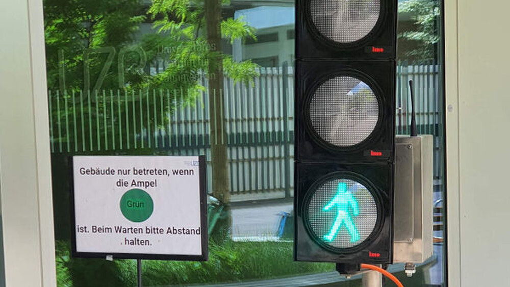Einrichten einer Zugangs-Signalisation zum Gebäude, welche auf Rot geschaltet wird, wenn sich zu viele Personen im Empfangsbereich befinden.