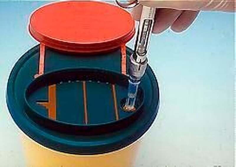 • Die Kanüle (auf der Spritze) wird einhändig in eine entsprechende Öffnung im Deckel des Sammelgefäßes gesteckt. Dann wird mit einer bestimmten Bewegung der Spritze die Kanüle gelöst, die in das Sammelgefäß fällt. Die Spritze wird in den allgemeinen Praxisabfall gegeben.