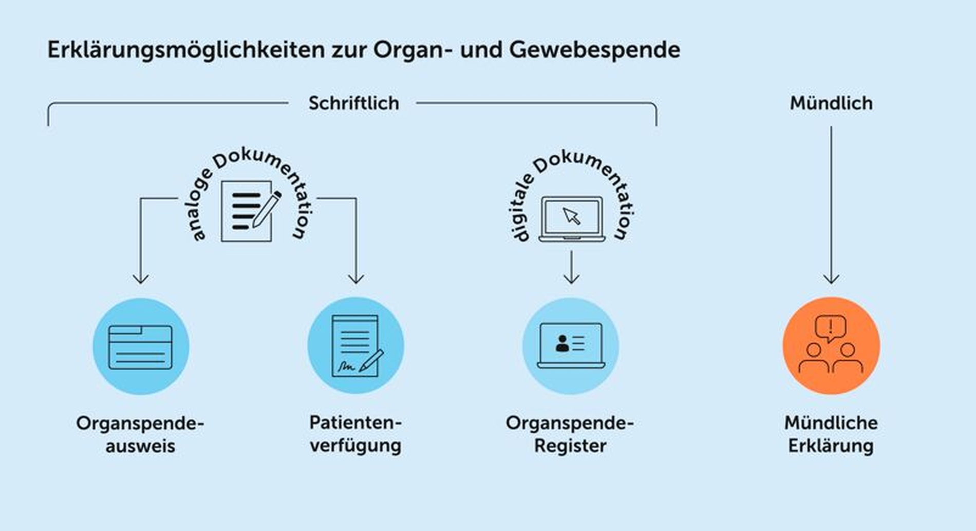 Um sicher zu sein, dass der Wille im Ernstfall auch während des Übergangszeitraums bis Januar 2025 verlässlich berücksichtigt wird, sollte man die persönliche Entscheidung zur Organ- und Gewebespende zusätzlich schriftlich – etwa im Organspendeausweis oder in der Patientenverfügung – dokumentieren, empfiehlt das BfArM auf der Info-Website. In jedem Fall sollten immer auch die nächsten Angehörigen über die Entscheidung und deren Dokumentation informiert sein.