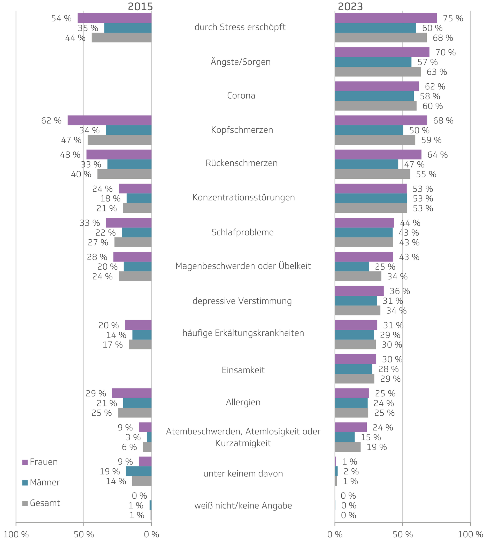 Neun Erkrankungen beziehungsweise Beschwerden waren sowohl in der Befragung 2023 als auch in der Befragung 2015 enthalten: Stress, Kopfschmerzen, Rückenschmerzen, Konzentrationsstörungen, Schlafprobleme, Magenbeschwerden, Erkältungskrankheiten, Allergien und Atembeschwerden. Beobachtung der TK: „Bei fast allen neun Erkrankungen beziehungsweise Beschwerden, die in beiden Jahren erhoben wurden, zeigt sich eine statistisch signifikante Zunahme zwischen 2015 und 2023.“