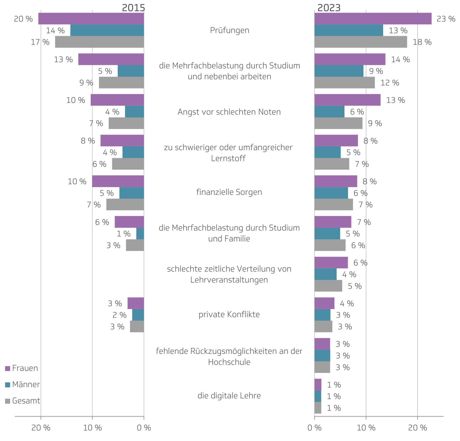 Die nachfolgende Grafik zeigt diese Stressursachen danach gestaffelt, wie viel Prozent der Studierenden diese als stark belastend wahrgenommen haben. Der Vergleich zeigt: Die Reihenfolge der in beiden Jahren erhobenen Belastungen ist beinahe gleich geblieben – nur die Angst vor schlechten Noten und die finanziellen Sorgen waren 2015 vertauscht. Und: Im Jahresvergleich falle positiv auf, dass die finanziellen Sorgen trotz der wirtschaftlichen und finanziellen Herausforderungen Anfang 2023 nicht signifikant zugenommen haben.
