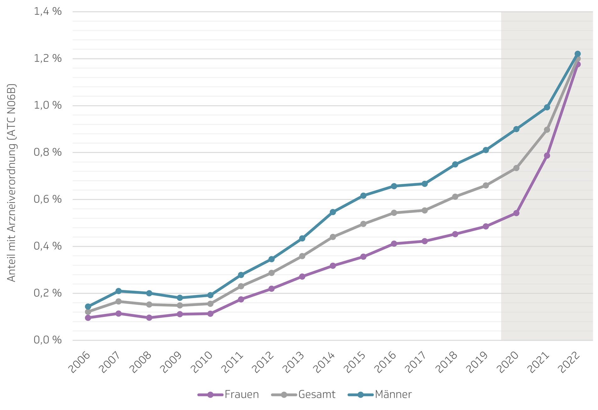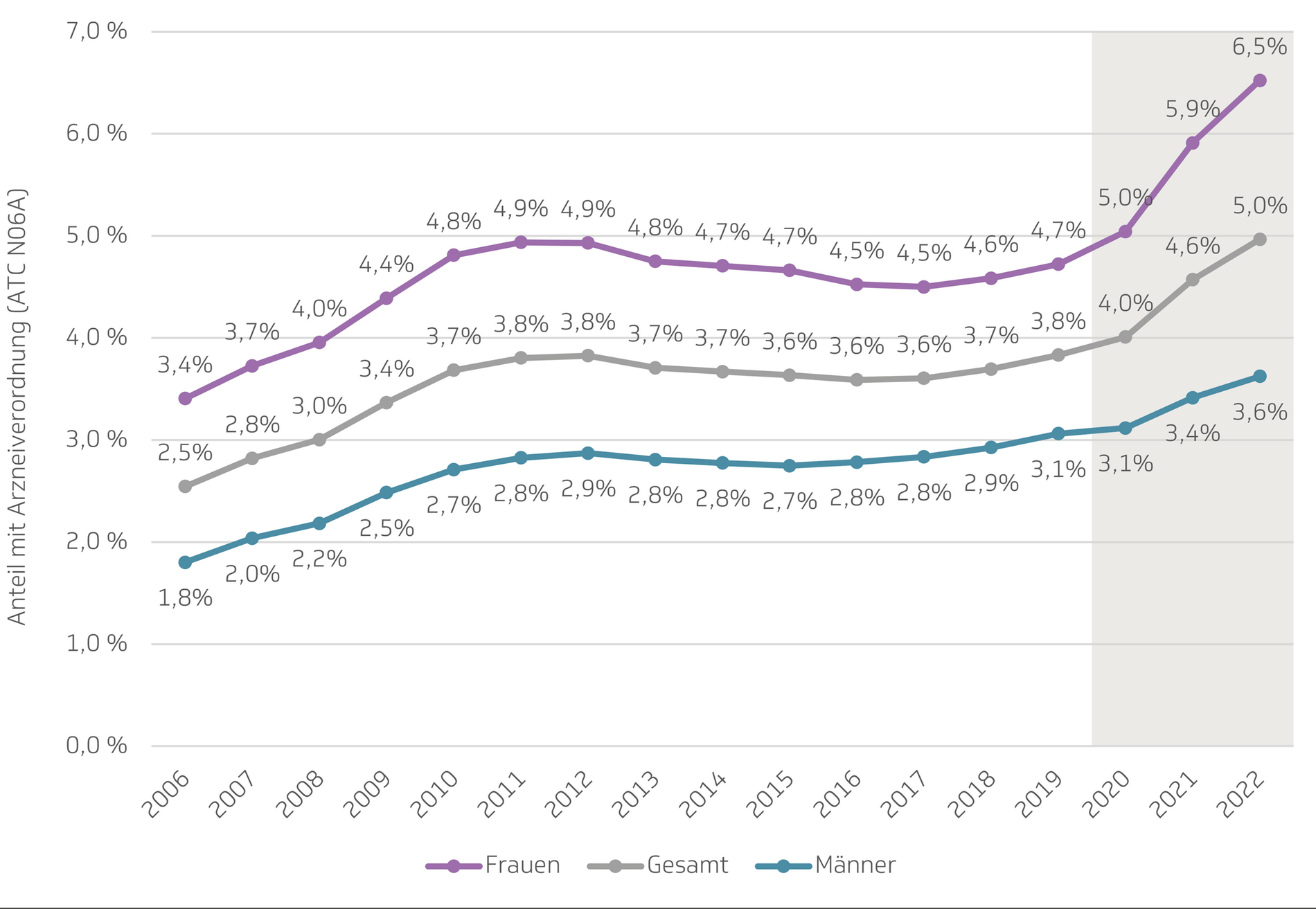 Auch die Verordnungen von Psychostimulanzien haben insbesondere in den Jahren 2021 und 2022 sehr stark zugenommen, zeigt der Report. Im Jahr 2022 waren weibliche Studierende erstmals in annähernd gleichem Umfang wie männliche Studierende von entsprechenden Verordnungen betroffen. Dabei wurden fast ausschließlich (in 95,3 Prozent der Fälle) die beiden Substanzen Methylphenidat (Handelsnamen Ritalin, Medikinet, Concerta) sowie Lisdexamfetamin (Handelsname Elvanse) verordnet.