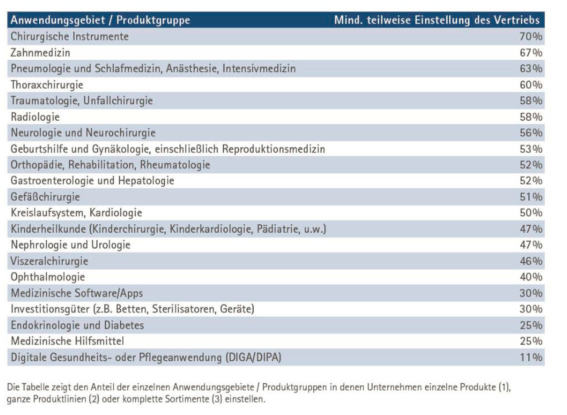 Die Produktgruppe mit den meisten eingestellten Artikeln sind laut Befragung chirurgische Instrumente wie Scheren, Nadelhalter und Pinzetten. Hier geben 70 Prozent der Hersteller an, mindestens einzelne Produkte vom EU-Markt zu nehmen. In der Zahnmedizin sind es 67 Prozent, darunter vor allem orthodontische Brackets und Drahtbögen. In der Pneumologie und Schlafmedizin, Anästhesie und Intensivmedizin stoppen 63 Prozent der Betriebe die Produktion, zumeist von Beatmungsstativen, Notfallbeatmungsgeräten oder auch Schlafdiagnosegeräten. Bei der Thoraxchirurgie sind es 60 Prozent, in der Traumatologie und Unfallchirurgie 58 Prozent und in der Radiologie 58 Prozent der Firmen.
