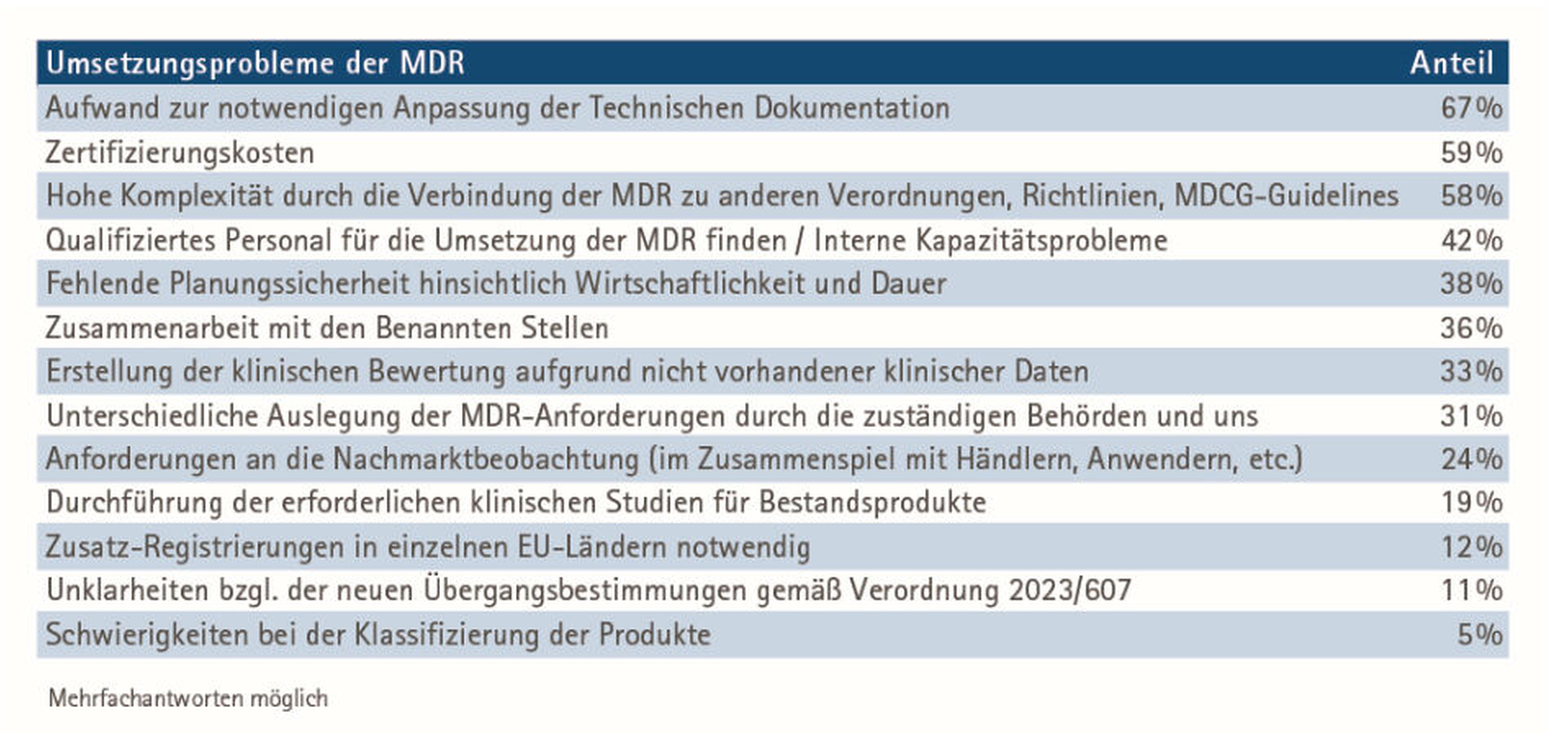 Generell stelle die MDR nahezu alle befragten Unternehmen vor große Umsetzungsprobleme: Drei Viertel der Betriebe sehen demzufolge negative Folgen für die Innovationstätigkeit, mehr als jede zweite Firma nehme einzelne Produkte oder komplette Produktionen und Sortimente vom Markt – tangiert seien davon alle 21 abgefragten Anwendungsgebiete.