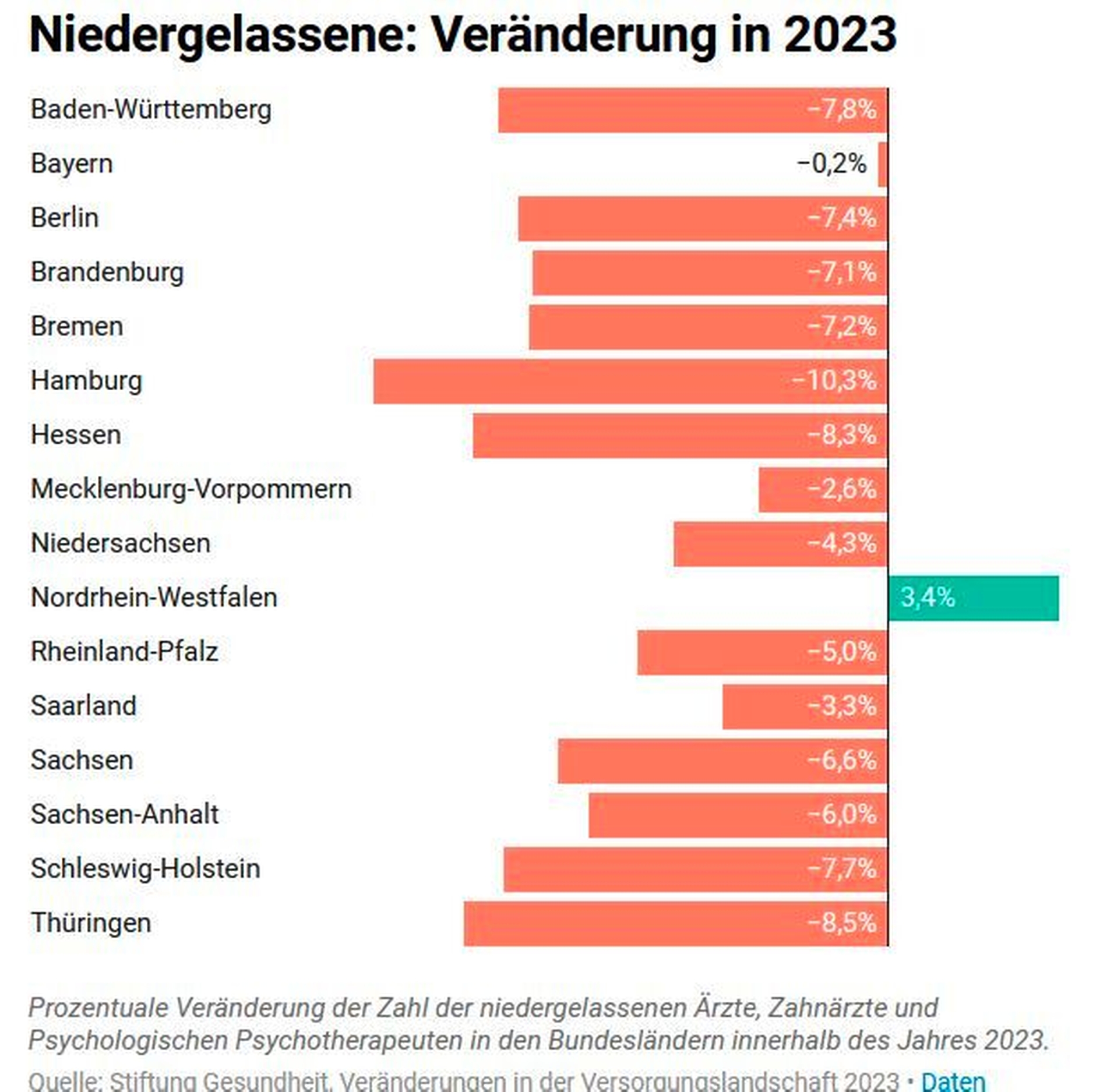 Hinzu kommt, dass die Zahl der niedergelassenen Ärzte in fast allen Bundesländern rückläufig ist. Wie bereits im Vorjahr ist die Zahl der Niedergelassenen in fast allen Bundesländern gesunken. Den stärksten Rückgang verzeichnet Hamburg mit einem Minus von 10,3 Prozent, gefolgt von Thüringen mit minus 8,5 Prozent. Nordrhein-Westfalen ist das einzige Bundesland, in dem die Zahl der Niedergelassenen 2023 mit einem Plus von 3,4 Prozent gestiegen ist.