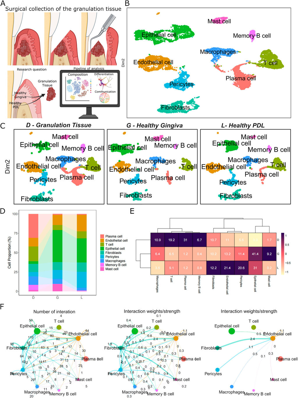 Für die Studie wurden Granulationsgewebeproben von drei Patienten entnommen, die sich einer Parodontaloperation unterzogen hatten. Das frische Gewebe wurde zu Einzelzellsuspensionen verarbeitet und mittels scRNA-Sequenzierung analysiert. Die Daten wurden integriert und mit bestehenden Datensätzen von gesundem Zahnfleisch und Parodontalligament verglichen. Die durchgeführten computergestützten Analysen wurden via Immunfluoreszenzfärbung validiert. In den Proben wurden zehn verschiedene Zellcluster identifiziert. Granulationsgewebe wies im Vergleich zu gesundem Gewebe eine höhere Dichte an Immunzellen auf. Eine neuartige, ausschließlich im Granulationsgewebe vorkommende Endothelzell-Subpopulation wurde entdeckt und durch NOTCH3-Expression sowie Beteiligung an Ossifikationsprozessen charakterisiert. Darüber hinaus zeigten Fibroblasten-Subpopulationen des Granulationsgewebes einen progenitorähnlichen Zustand, der durch eine Reorganisation der extrazellulären Matrix und eine geringe Differenzierung gekennzeichnet ist, ähnlich wie bei tumorassoziierten Fibroblasten.