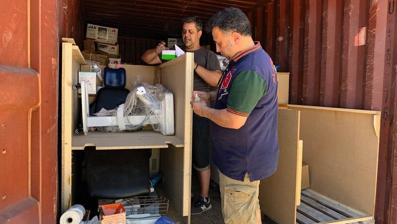 Beispiel Chios: Im Sommer 2021 eröffneten wir auf der griechischen Insel eine Zahnklinik im Flüchtlingslager Vial. Auch hier kamen ausschließlich gebrauchte Geräte aus Deutschland zum Einsatz, die wir sorgfältig verpackt in großen Holzkisten auf die Insel transportierten. Als wir das Lager im Dezember 2023 aufgrund politischer Entscheidungen verlassen mussten, wurden alle Materialien in Überseecontainern zwischengelagert. Mit der Wiedereröffnung der Klinik im Oktober 2025 stand die Frage im Raum: Was tun mit den massiven Kisten?