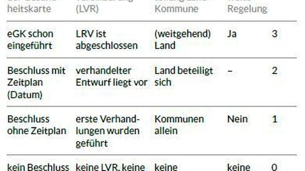 Anhand einer Tabelle (oben links) werden für jede Frage vier mögliche Stufen beschrieben, auf einer Skala von 0 bis 3. Die Skala soll den Umsetzungsstand der eGK im jeweiligen Bereich anschaulich machen - und ermöglicht ein Ranking der Bundesländer (oben rechts). Ein Vergleich, in dem allerdings Bayern und Sachsen fehlen, da sie die eGK ablehnen.