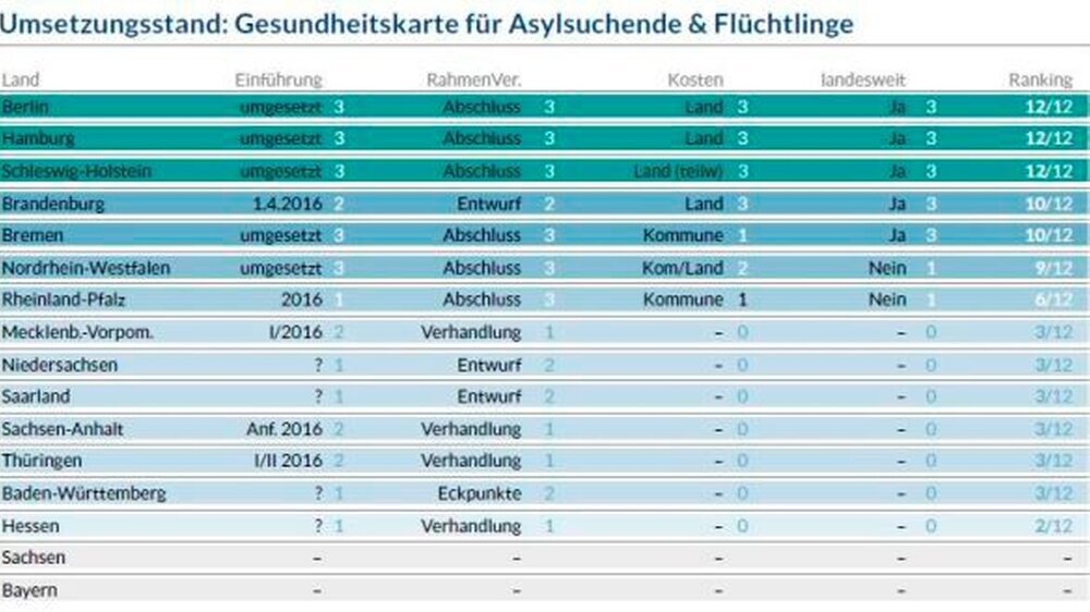 Aktuell wollen 14 Bundesländer die Gesundheitskarte für Asylsuchende und Flüchtlinge einführen. Doch der Umsetzungsstand ist keineswegs einheitlich, wie eine im Februar 2016 veröffentlichte Studie der Bertelsmann Stiftung zeigt.
